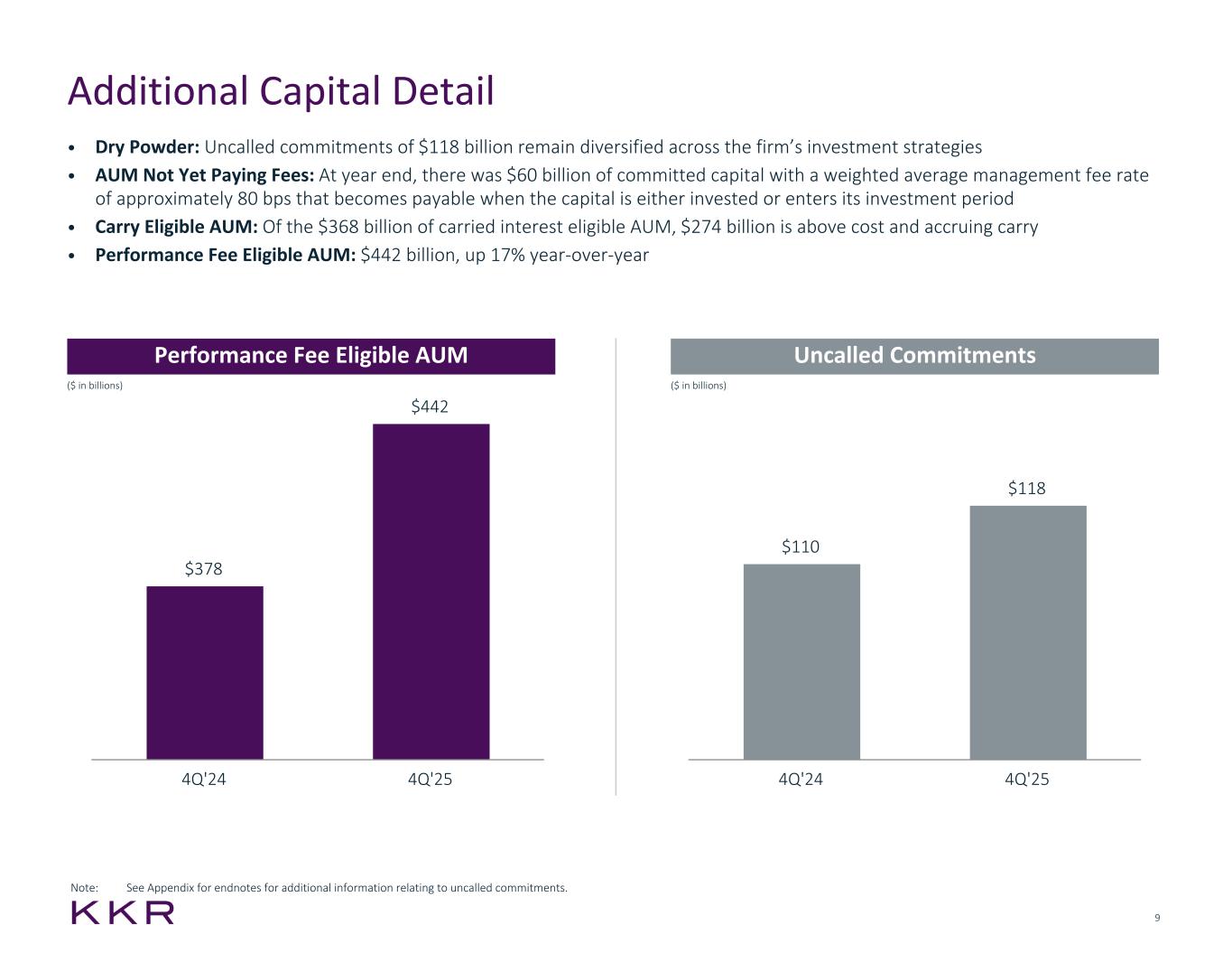 8 Assets Under Management • AUM of $744 billion, up 17% year-over-year, with $28 billion of organic new capital raised in the quarter and $129 billion for the year • K-Series AUM totaled $34 billion across asset classes compared to $16 billion a year prior • Fee Paying AUM of $604 billion, up 18% year-over-year, with $33 billion of organic new capital raised in the quarter and $129 billion for the year • Perpetual Capital of $321 billion, up 20% year-over-year driven primarily by the organic growth of Global Atlantic and from inflows into our K-Series vehicles. Perpetual capital represents 43% of AUM and 51% of FPAUM AUM Fee Paying AUM Perpetual Capital ($ in billions) ($ in billions) ($ in billions) $638 $744 4Q'24 4Q'25 $512 $604 4Q'24 4Q'25 $268 $321 4Q'24 4Q'25 Note: Perpetual capital is capital of indefinite duration, which may be reduced or terminated under certain conditions. See Appendix for endnotes about perpetual capital and other important information.