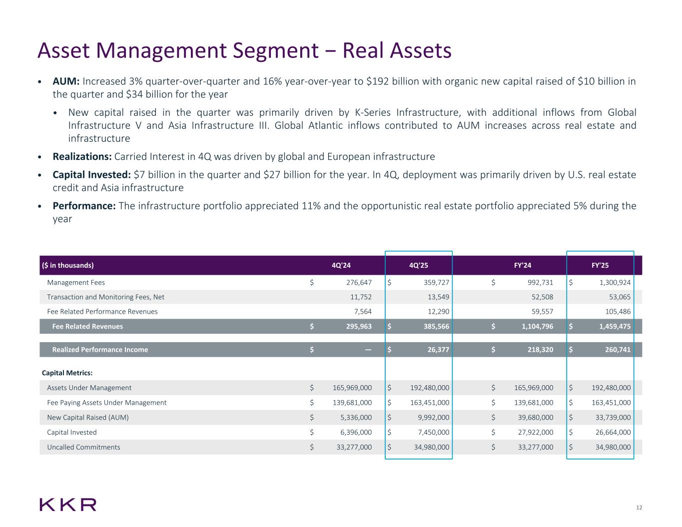 11 • AUM: Increased 3% quarter-over-quarter and 17% year-over-year to $229 billion with organic new capital raised of $5 billion in the quarter and $27 billion for the year • New capital raised in the quarter was primarily driven by North America Fund XIV and K-Series Private Equity • Realizations: Carried Interest drivers in 4Q included realization events across traditional private equity and growth equity, as well as the impact of the previously disclosed carried interest repayment obligation(1) • Capital Invested: $9 billion in the quarter and $24 billion for the year. In 4Q, deployment was primarily driven by traditional private equity in Europe and the Americas, as well as core private equity • Performance: The traditional private equity portfolio appreciated 14% during the year Asset Management Segment − Private Equity ($ in thousands) 4Q'24 4Q'25 FY'24 FY'25 Management Fees $ 336,525 $ 427,903 $ 1,376,335 $ 1,529,169 Transaction and Monitoring Fees, Net 38,868 24,046 100,619 93,707 Fee Related Performance Revenues — 2,506 — 2,506 Fee Related Revenues $ 375,393 $ 454,455 $ 1,476,954 $ 1,625,382 Realized Performance Income $ 435,613 $ (70,911) $ 1,312,479 $ 1,321,116 Capital Metrics: Assets Under Management $ 195,358,000 $ 229,374,000 $ 195,358,000 $ 229,374,000 Fee Paying Assets Under Management $ 119,598,000 $ 151,239,000 $ 119,598,000 $ 151,239,000 New Capital Raised (AUM) $ 9,509,000 $ 5,217,000 $ 17,660,000 $ 27,176,000 Capital Invested $ 7,294,000 $ 8,913,000 $ 17,062,000 $ 24,100,000 Uncalled Commitments $ 54,882,000 $ 52,318,000 $ 54,882,000 $ 52,318,000 Note: See Appendix for endnotes about our private equity business line and other important information. (1) Realized Performance Income of $(71) million in 4Q'25 was negatively impacted by $207 million as a result of the previously disclosed carried interest repayment obligation. (1)