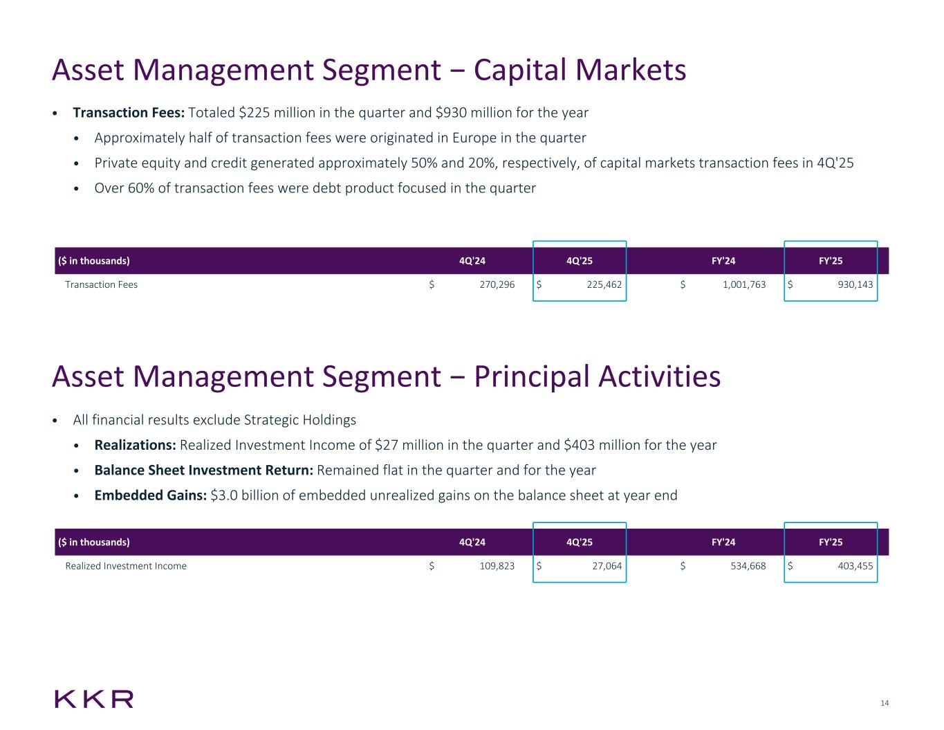13 • AUM: Increased 2% quarter-over-quarter and 17% year-over-year to $322 billion with organic new capital raised of $13 billion in the quarter and $68 billion for the year • New capital raised in the quarter was primarily driven by inflows at Global Atlantic, CLO issuances, K-Series Credit and Asia Credit Opportunities II • AUM comprised of: $145 billion of leveraged credit, $85 billion of asset-based finance, $50 billion of direct lending, $8 billion of strategic investments and $34 billion of liquid strategies • Realizations: Performance Income in 4Q was driven by the annual crystallization of Marshall Wace incentive fees • Capital Invested: $15 billion in the quarter and $44 billion for the year. In 4Q, deployment was most active in asset-based finance • Performance: The leveraged credit composite appreciated 6% and the alternative credit composite appreciated 8% during the year ($ in thousands) 4Q'24 4Q'25 FY'24 FY'25 Management Fees $ 292,946 $ 336,561 $ 1,092,315 $ 1,270,748 Transaction and Monitoring Fees, Net 2,881 5,638 10,994 15,662 Fee Related Performance Revenues 17,527 18,797 78,435 73,792 Fee Related Revenues $ 313,354 $ 360,996 $ 1,181,744 $ 1,360,202 Realized Performance Income $ 240,728 $ 226,617 $ 291,316 $ 297,655 Capital Metrics: Assets Under Management $ 276,245,000 $ 322,004,000 $ 276,245,000 $ 322,004,000 Fee Paying Assets Under Management $ 252,684,000 $ 289,454,000 $ 252,684,000 $ 289,454,000 New Capital Raised (AUM) $ 11,866,000 $ 13,050,000 $ 56,302,000 $ 68,484,000 Capital Invested $ 8,949,000 $ 15,472,000 $ 38,586,000 $ 43,846,000 Uncalled Commitments $ 21,396,000 $ 31,135,000 $ 21,396,000 $ 31,135,000 Asset Management Segment − Credit and Liquid Strategies