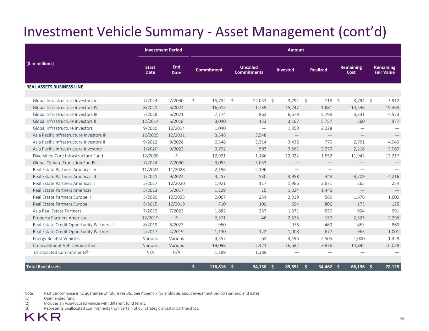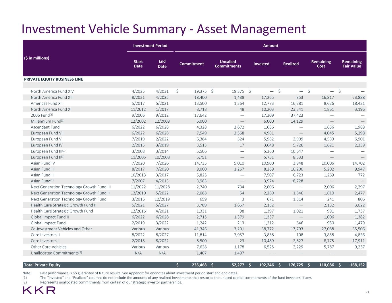 24 Investment Vehicle Summary - Asset Management ($ in millions) Investment Period Amount Start Date End Date Commitment Uncalled Commitments Invested Realized Remaining Cost Remaining Fair Value PRIVATE EQUITY BUSINESS LINE North America Fund XIV 4/2025 4/2031 $ 19,375 $ 19,375 $ — $ — $ — $ — North America Fund XIII 8/2021 4/2025 18,400 1,438 17,265 353 16,817 23,888 Americas Fund XII 5/2017 5/2021 13,500 1,364 12,773 16,281 8,626 18,431 North America Fund XI 11/2012 1/2017 8,718 48 10,203 23,541 1,861 3,196 2006 Fund(1) 9/2006 9/2012 17,642 — 17,309 37,423 — — Millennium Fund(1) 12/2002 12/2008 6,000 — 6,000 14,129 — — Ascendant Fund 6/2022 6/2028 4,328 2,672 1,656 — 1,656 1,988 European Fund VI 6/2022 6/2028 7,549 2,568 4,981 — 4,045 5,298 European Fund V 7/2019 2/2022 6,384 524 5,982 2,909 4,539 6,901 European Fund IV 2/2015 3/2019 3,513 17 3,648 5,726 1,621 2,339 European Fund III(1) 3/2008 3/2014 5,506 — 5,360 10,647 — — European Fund II(1) 11/2005 10/2008 5,751 — 5,751 8,533 — — Asian Fund IV 7/2020 7/2026 14,735 5,010 10,900 3,948 10,006 14,702 Asian Fund III 8/2017 7/2020 9,000 1,267 8,269 10,200 5,202 9,947 Asian Fund II 10/2013 3/2017 5,825 — 7,507 6,723 1,269 772 Asian Fund(1) 7/2007 4/2013 3,983 — 3,974 8,728 — — Next Generation Technology Growth Fund III 11/2022 11/2028 2,740 734 2,006 — 2,006 2,297 Next Generation Technology Growth Fund II 12/2019 5/2022 2,088 54 2,269 1,846 1,610 2,477 Next Generation Technology Growth Fund 3/2016 12/2019 659 3 671 1,314 241 806 Health Care Strategic Growth Fund II 5/2021 5/2027 3,789 1,657 2,132 — 2,132 3,022 Health Care Strategic Growth Fund 12/2016 4/2021 1,331 98 1,397 1,021 991 1,737 Global Impact Fund II 6/2022 6/2028 2,715 1,379 1,337 — 1,006 1,382 Global Impact Fund 2/2019 3/2022 1,242 213 1,212 646 950 1,479 Co-Investment Vehicles and Other Various Various 41,346 3,291 38,772 17,793 27,088 35,506 Core Investors II 8/2022 8/2027 11,814 7,957 3,858 108 3,858 4,836 Core Investors I 2/2018 8/2022 8,500 23 10,489 2,627 8,775 17,911 Other Core Vehicles Various Various 7,628 1,178 6,525 2,229 5,787 9,237 Unallocated Commitments(2) N/A N/A 1,407 1,407 — — — — Total Private Equity $ 235,468 $ 52,277 $ 192,246 $ 176,725 $ 110,086 $ 168,152 Note: Past performance is no guarantee of future results. See Appendix for endnotes about investment period start and end dates. (1) The “Invested" and “Realized” columns do not include the amounts of any realized investments that restored the unused capital commitments of the fund investors, if any. (2) Represents unallocated commitments from certain of our strategic investor partnerships.