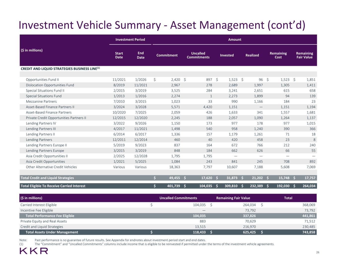 25 Note: Past performance is no guarantee of future results. See Appendix for endnotes about investment period start and end dates. (1) Open ended fund. (2) Includes an Asia-focused vehicle with different fund terms. (3) Represents unallocated commitments from certain of our strategic investor partnerships. Investment Vehicle Summary - Asset Management (cont’d) ($ in millions) Investment Period Amount Start Date End Date Commitment Uncalled Commitments Invested Realized Remaining Cost Remaining Fair Value REAL ASSETS BUSINESS LINE Global Infrastructure Investors V 7/2024 7/2030 $ 15,732 $ 12,051 $ 3,794 $ 113 $ 3,794 $ 3,912 Global Infrastructure Investors IV 8/2021 6/2024 16,615 1,739 15,247 1,681 14,536 19,468 Global Infrastructure Investors III 7/2018 6/2021 7,174 862 6,678 5,798 3,331 4,573 Global Infrastructure Investors II 12/2014 6/2018 3,040 133 3,167 5,757 560 977 Global Infrastructure Investors 9/2010 10/2014 1,040 — 1,050 2,228 — — Asia Pacific Infrastructure Investors III 12/2025 12/2031 3,548 3,548 — — — — Asia Pacific Infrastructure Investors II 9/2022 9/2028 6,348 3,314 3,436 770 2,761 4,049 Asia Pacific Infrastructure Investors 1/2020 9/2022 3,792 593 3,561 2,279 2,216 3,069 Diversified Core Infrastructure Fund 12/2020 (1) 12,921 1,186 12,022 1,552 11,943 13,217 Global Climate Transition Fund(2) 7/2024 7/2030 3,053 3,053 — — — — Real Estate Partners Americas IV 11/2024 11/2028 2,196 2,196 — — — — Real Estate Partners Americas III 1/2021 9/2024 4,253 530 3,958 348 3,709 4,216 Real Estate Partners Americas II 5/2017 12/2020 1,921 117 1,986 2,871 265 254 Real Estate Partners Americas 5/2013 5/2017 1,229 15 1,024 1,445 — — Real Estate Partners Europe II 3/2020 12/2023 2,067 254 2,019 569 1,676 1,602 Real Estate Partners Europe 8/2015 12/2019 710 100 694 806 173 125 Asia Real Estate Partners 7/2019 7/2023 1,682 357 1,371 559 994 991 Property Partners Americas 12/2019 (1) 2,571 46 2,525 159 2,525 2,296 Real Estate Credit Opportunity Partners II 8/2019 6/2023 950 — 976 469 853 869 Real Estate Credit Opportunity Partners 2/2017 4/2019 1,130 122 1,008 677 965 1,001 Energy Related Vehicles Various Various 4,357 62 4,493 2,505 1,000 1,428 Co-Investment Vehicles & Other Various Various 19,098 2,471 16,682 3,876 14,895 16,078 Unallocated Commitments(3) N/A N/A 1,389 1,389 — — — — Total Real Assets $ 116,816 $ 34,138 $ 85,691 $ 34,462 $ 66,196 $ 78,125