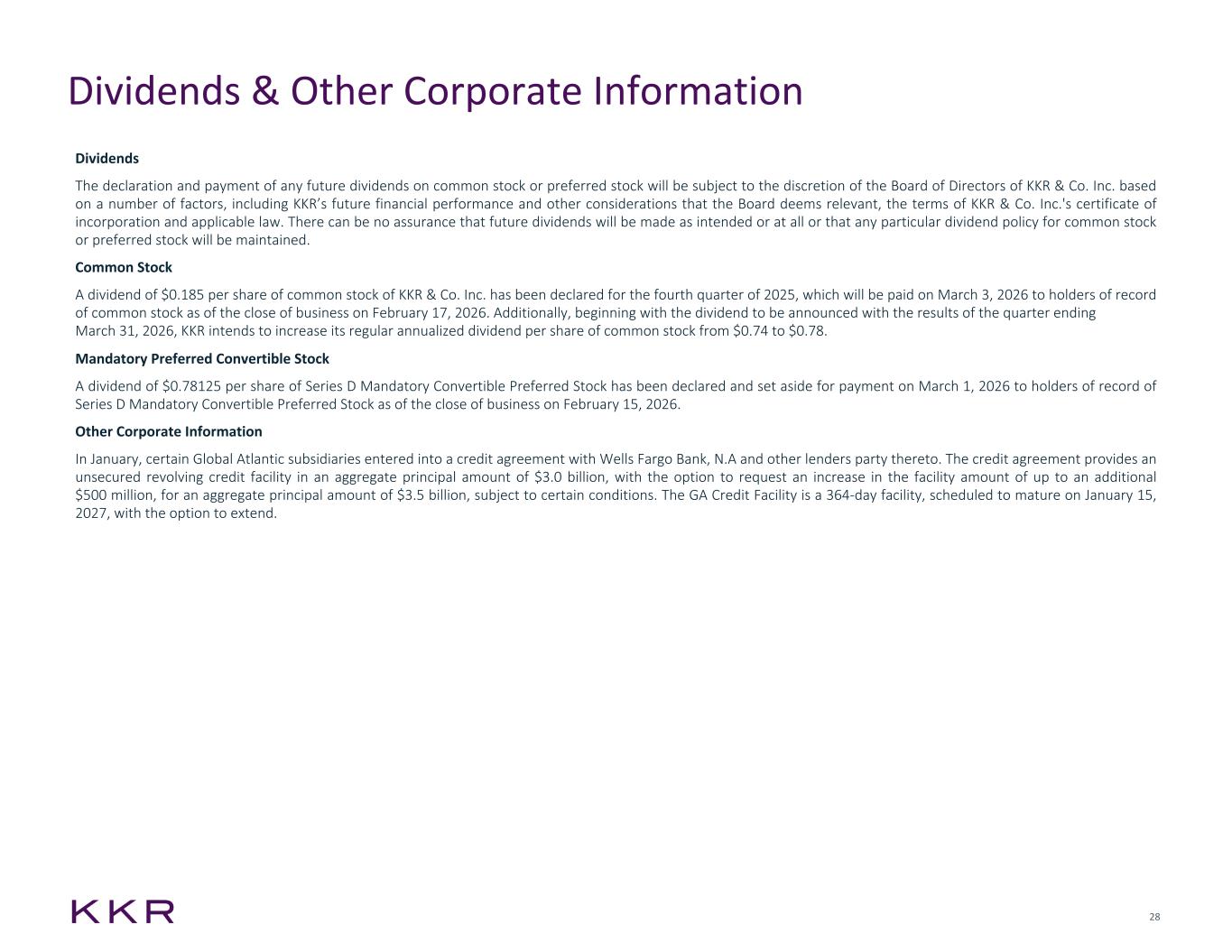 28 Dividends & Other Corporate Information Dividends The declaration and payment of any future dividends on common stock or preferred stock will be subject to the discretion of the Board of Directors of KKR & Co. Inc. based on a number of factors, including KKR’s future financial performance and other considerations that the Board deems relevant, the terms of KKR & Co. Inc.'s certificate of incorporation and applicable law. There can be no assurance that future dividends will be made as intended or at all or that any particular dividend policy for common stock or preferred stock will be maintained. Common Stock A dividend of $0.185 per share of common stock of KKR & Co. Inc. has been declared for the fourth quarter of 2025, which will be paid on March 3, 2026 to holders of record of common stock as of the close of business on February 17, 2026. Additionally, beginning with the dividend to be announced with the results of the quarter ending March 31, 2026, KKR intends to increase its regular annualized dividend per share of common stock from $0.74 to $0.78. Mandatory Preferred Convertible Stock A dividend of $0.78125 per share of Series D Mandatory Convertible Preferred Stock has been declared and set aside for payment on March 1, 2026 to holders of record of Series D Mandatory Convertible Preferred Stock as of the close of business on February 15, 2026. Other Corporate Information In January, certain Global Atlantic subsidiaries entered into a credit agreement with Wells Fargo Bank, N.A and other lenders party thereto. The credit agreement provides an unsecured revolving credit facility in an aggregate principal amount of $3.0 billion, with the option to request an increase in the facility amount of up to an additional $500 million, for an aggregate principal amount of $3.5 billion, subject to certain conditions. The GA Credit Facility is a 364-day facility, scheduled to mature on January 15, 2027, with the option to extend.