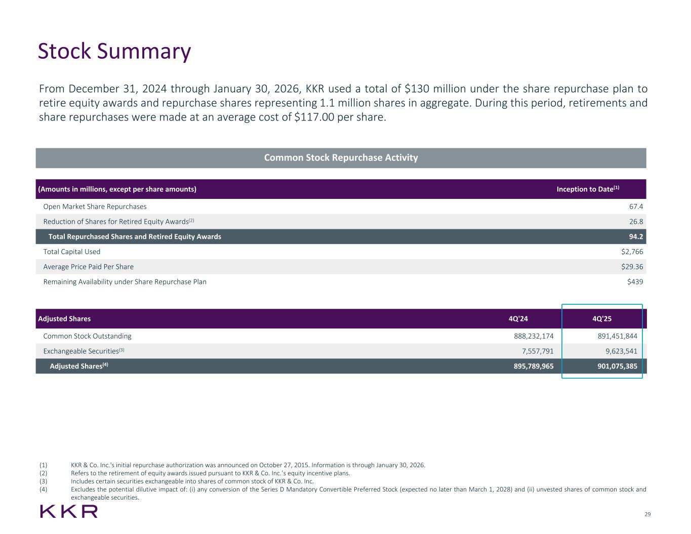 29 (1) KKR & Co. Inc.'s initial repurchase authorization was announced on October 27, 2015. Information is through January 30, 2026. (2) Refers to the retirement of equity awards issued pursuant to KKR & Co. Inc.’s equity incentive plans. (3) Includes certain securities exchangeable into shares of common stock of KKR & Co. Inc. (4) Excludes the potential dilutive impact of: (i) any conversion of the Series D Mandatory Convertible Preferred Stock (expected no later than March 1, 2028) and (ii) unvested shares of common stock and exchangeable securities. Stock Summary From December 31, 2024 through January 30, 2026, KKR used a total of $130 million under the share repurchase plan to retire equity awards and repurchase shares representing 1.1 million shares in aggregate. During this period, retirements and share repurchases were made at an average cost of $117.00 per share. Common Stock Repurchase Activity (Amounts in millions, except per share amounts) Inception to Date(1) Open Market Share Repurchases 67.4 Reduction of Shares for Retired Equity Awards(2) 26.8 Total Repurchased Shares and Retired Equity Awards 94.2 Total Capital Used $2,766 Average Price Paid Per Share $29.36 Remaining Availability under Share Repurchase Plan $439 Adjusted Shares 4Q'24 4Q'25 Common Stock Outstanding 888,232,174 891,451,844 Exchangeable Securities(3) 7,557,791 9,623,541 Adjusted Shares(4) 895,789,965 901,075,385