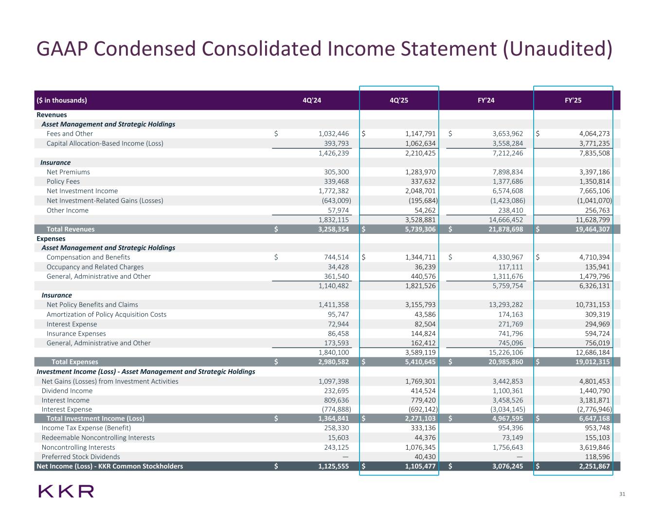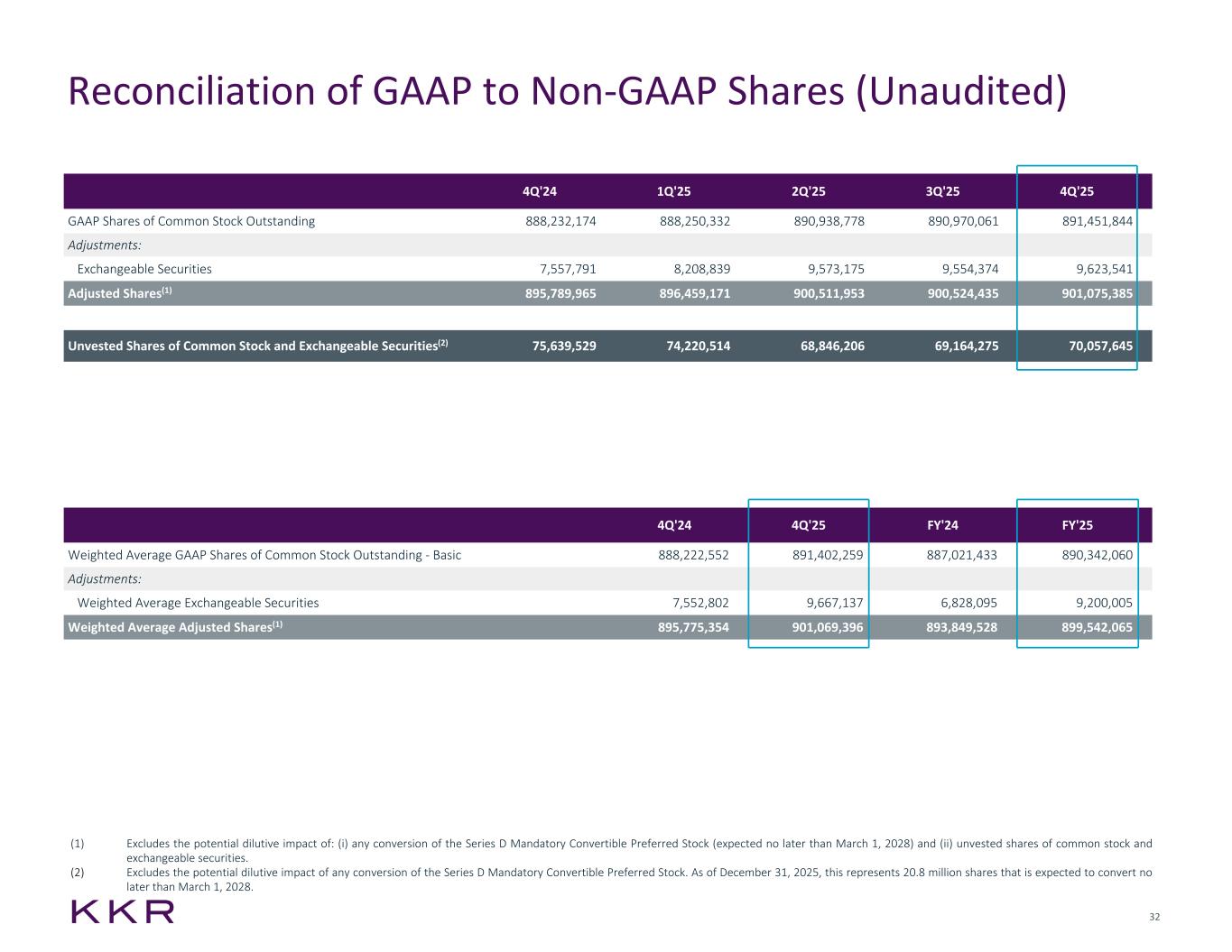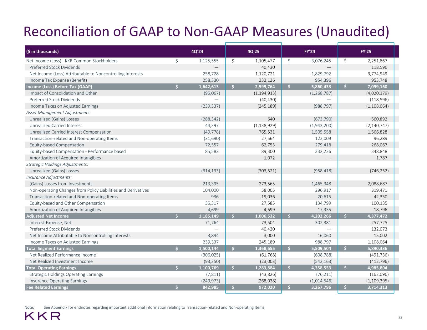 31 GAAP Condensed Consolidated Income Statement (Unaudited) ($ in thousands) 4Q'24 4Q'25 FY'24 FY'25 Revenues Asset Management and Strategic Holdings Fees and Other $ 1,032,446 $ 1,147,791 $ 3,653,962 $ 4,064,273 Capital Allocation-Based Income (Loss) 393,793 1,062,634 3,558,284 3,771,235 1,426,239 2,210,425 7,212,246 7,835,508 Insurance Net Premiums 305,300 1,283,970 7,898,834 3,397,186 Policy Fees 339,468 337,632 1,377,686 1,350,814 Net Investment Income 1,772,382 2,048,701 6,574,608 7,665,106 Net Investment-Related Gains (Losses) (643,009) (195,684) (1,423,086) (1,041,070) Other Income 57,974 54,262 238,410 256,763 1,832,115 3,528,881 14,666,452 11,628,799 Total Revenues $ 3,258,354 $ 5,739,306 $ 21,878,698 $ 19,464,307 Expenses Asset Management and Strategic Holdings Compensation and Benefits $ 744,514 $ 1,344,711 $ 4,330,967 $ 4,710,394 Occupancy and Related Charges 34,428 36,239 117,111 135,941 General, Administrative and Other 361,540 440,576 1,311,676 1,479,796 1,140,482 1,821,526 5,759,754 6,326,131 Insurance Net Policy Benefits and Claims 1,411,358 3,155,793 13,293,282 10,731,153 Amortization of Policy Acquisition Costs 95,747 43,586 174,163 309,319 Interest Expense 72,944 82,504 271,769 294,969 Insurance Expenses 86,458 144,824 741,796 594,724 General, Administrative and Other 173,593 162,412 745,096 756,019 1,840,100 3,589,119 15,226,106 12,686,184 Total Expenses $ 2,980,582 $ 5,410,645 $ 20,985,860 $ 19,012,315 Investment Income (Loss) - Asset Management and Strategic Holdings Net Gains (Losses) from Investment Activities 1,097,398 1,769,301 3,442,853 4,801,453 Dividend Income 232,695 414,524 1,100,361 1,440,790 Interest Income 809,636 779,420 3,458,526 3,181,871 Interest Expense (774,888) (692,142) (3,034,145) (2,776,946) Total Investment Income (Loss) $ 1,364,841 $ 2,271,103 $ 4,967,595 $ 6,647,168 Income Tax Expense (Benefit) 258,330 333,136 954,396 953,748 Redeemable Noncontrolling Interests 15,603 44,376 73,149 155,103 Noncontrolling Interests 243,125 1,076,345 1,756,643 3,619,846 Preferred Stock Dividends — 40,430 — 118,596 Net Income (Loss) - KKR Common Stockholders $ 1,125,555 $ 1,105,477 $ 3,076,245 $ 2,251,867