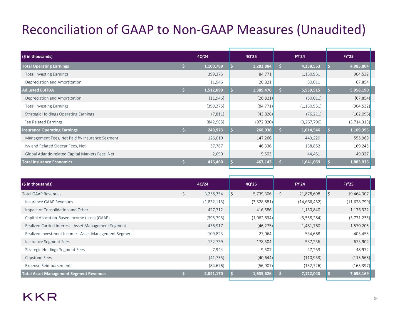 33 Reconciliation of GAAP to Non-GAAP Measures (Unaudited) ($ in thousands) 4Q'24 4Q'25 FY'24 FY'25 Net Income (Loss) - KKR Common Stockholders $ 1,125,555 $ 1,105,477 $ 3,076,245 $ 2,251,867 Preferred Stock Dividends — 40,430 — 118,596 Net Income (Loss) Attributable to Noncontrolling Interests 258,728 1,120,721 1,829,792 3,774,949 Income Tax Expense (Benefit) 258,330 333,136 954,396 953,748 Income (Loss) Before Tax (GAAP) $ 1,642,613 $ 2,599,764 $ 5,860,433 $ 7,099,160 Impact of Consolidation and Other (95,067) (1,194,913) (1,268,787) (4,020,179) Preferred Stock Dividends — (40,430) — (118,596) Income Taxes on Adjusted Earnings (239,337) (245,189) (988,797) (1,108,064) Asset Management Adjustments: Unrealized (Gains) Losses (288,342) 640 (673,790) 560,892 Unrealized Carried Interest 44,397 (1,138,929) (1,943,200) (2,140,747) Unrealized Carried Interest Compensation (49,778) 765,531 1,505,558 1,566,828 Transaction-related and Non-operating Items (31,690) 27,564 122,009 96,289 Equity-based Compensation 72,557 62,753 279,418 268,067 Equity-based Compensation - Performance based 85,582 89,300 332,226 348,848 Amortization of Acquired Intangibles — 1,072 — 1,787 Strategic Holdings Adjustments: Unrealized (Gains) Losses (314,133) (303,521) (958,418) (746,252) Insurance Adjustments: (Gains) Losses from Investments 213,395 273,565 1,465,348 2,088,687 Non-operating Changes from Policy Liabilities and Derivatives 104,000 58,005 296,917 319,471 Transaction-related and Non-operating Items 936 19,036 20,615 42,350 Equity-based and Other Compensation 35,317 27,585 134,799 100,135 Amortization of Acquired Intangibles 4,699 4,699 17,935 18,796 Adjusted Net Income $ 1,185,149 $ 1,006,532 $ 4,202,266 $ 4,377,472 Interest Expense, Net 71,764 73,504 302,381 257,725 Preferred Stock Dividends — 40,430 — 132,073 Net Income Attributable to Noncontrolling Interests 3,894 3,000 16,060 15,002 Income Taxes on Adjusted Earnings 239,337 245,189 988,797 1,108,064 Total Segment Earnings $ 1,500,144 $ 1,368,655 $ 5,509,504 $ 5,890,336 Net Realized Performance Income (306,025) (61,768) (608,788) (491,736) Net Realized Investment Income (93,350) (23,003) (542,163) (412,796) Total Operating Earnings $ 1,100,769 $ 1,283,884 $ 4,358,553 $ 4,985,804 Strategic Holdings Operating Earnings (7,811) (43,826) (76,211) (162,096) Insurance Operating Earnings (249,973) (268,038) (1,014,546) (1,109,395) Fee Related Earnings $ 842,985 $ 972,020 $ 3,267,796 $ 3,714,313 Note: See Appendix for endnotes regarding important additional information relating to Transaction-related and Non-operating Items.