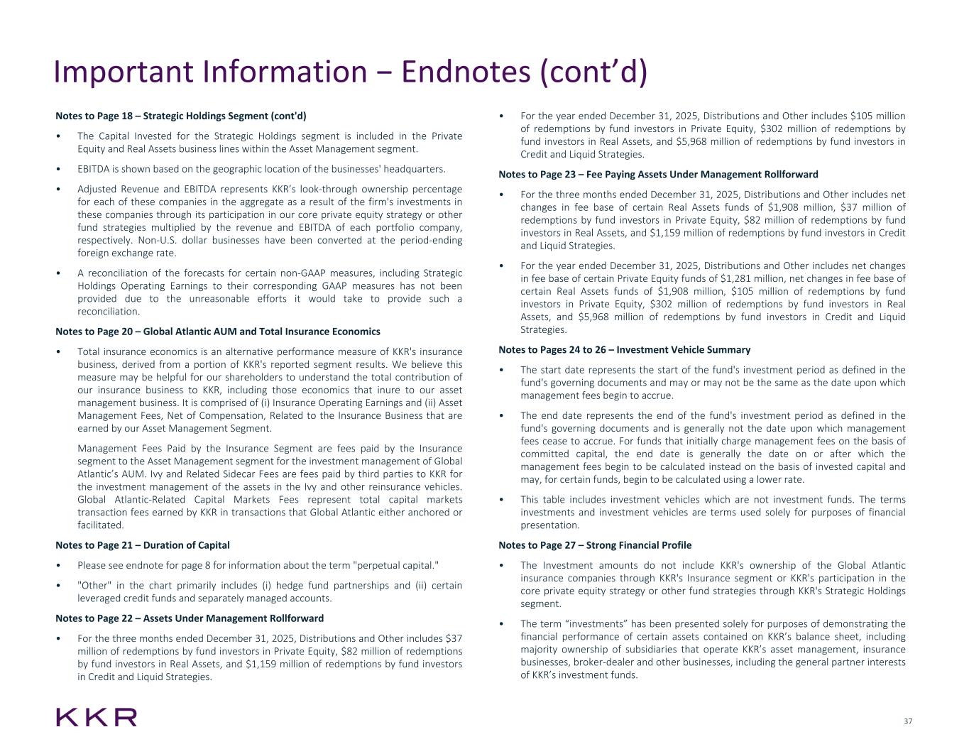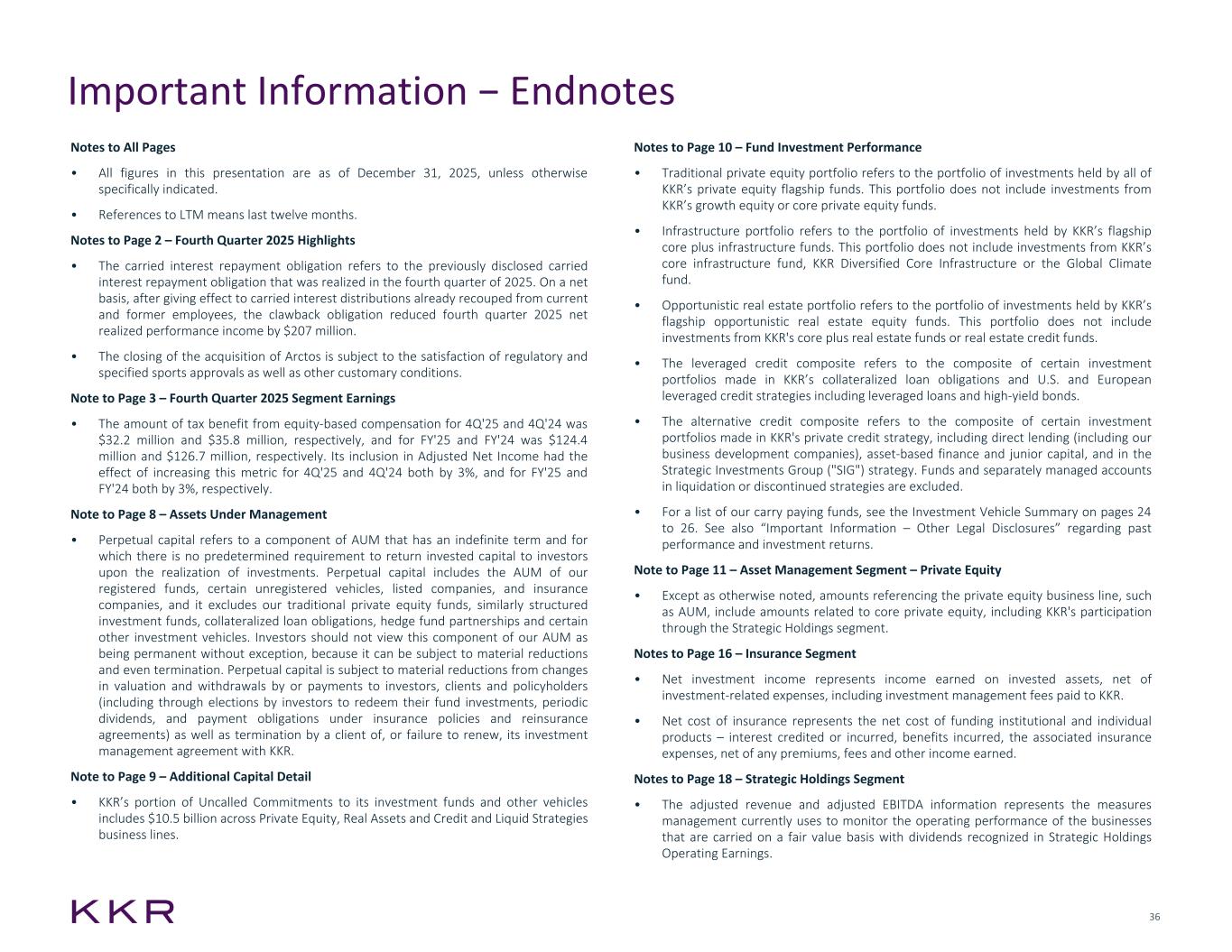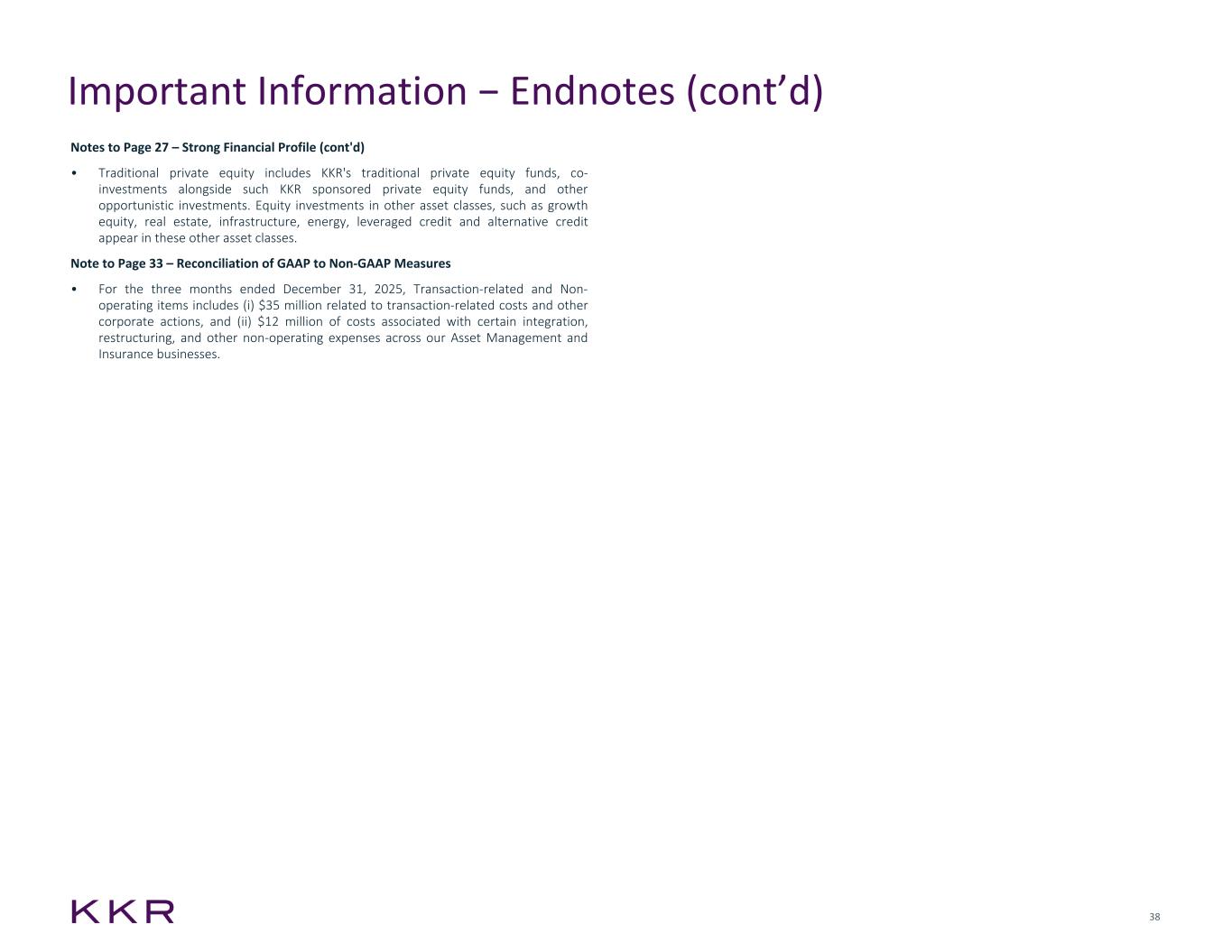 37 Notes to Page 18 – Strategic Holdings Segment (cont'd) • The Capital Invested for the Strategic Holdings segment is included in the Private Equity and Real Assets business lines within the Asset Management segment. • EBITDA is shown based on the geographic location of the businesses' headquarters. • Adjusted Revenue and EBITDA represents KKR’s look-through ownership percentage for each of these companies in the aggregate as a result of the firm's investments in these companies through its participation in our core private equity strategy or other fund strategies multiplied by the revenue and EBITDA of each portfolio company, respectively. Non-U.S. dollar businesses have been converted at the period-ending foreign exchange rate. • A reconciliation of the forecasts for certain non-GAAP measures, including Strategic Holdings Operating Earnings to their corresponding GAAP measures has not been provided due to the unreasonable efforts it would take to provide such a reconciliation. Notes to Page 20 – Global Atlantic AUM and Total Insurance Economics • Total insurance economics is an alternative performance measure of KKR's insurance business, derived from a portion of KKR's reported segment results. We believe this measure may be helpful for our shareholders to understand the total contribution of our insurance business to KKR, including those economics that inure to our asset management business. It is comprised of (i) Insurance Operating Earnings and (ii) Asset Management Fees, Net of Compensation, Related to the Insurance Business that are earned by our Asset Management Segment. Management Fees Paid by the Insurance Segment are fees paid by the Insurance segment to the Asset Management segment for the investment management of Global Atlantic’s AUM. Ivy and Related Sidecar Fees are fees paid by third parties to KKR for the investment management of the assets in the Ivy and other reinsurance vehicles. Global Atlantic-Related Capital Markets Fees represent total capital markets transaction fees earned by KKR in transactions that Global Atlantic either anchored or facilitated. Notes to Page 21 – Duration of Capital • Please see endnote for page 8 for information about the term "perpetual capital." • "Other" in the chart primarily includes (i) hedge fund partnerships and (ii) certain leveraged credit funds and separately managed accounts. Notes to Page 22 – Assets Under Management Rollforward • For the three months ended December 31, 2025, Distributions and Other includes $37 million of redemptions by fund investors in Private Equity, $82 million of redemptions by fund investors in Real Assets, and $1,159 million of redemptions by fund investors in Credit and Liquid Strategies. Important Information − Endnotes (cont’d) • For the year ended December 31, 2025, Distributions and Other includes $105 million of redemptions by fund investors in Private Equity, $302 million of redemptions by fund investors in Real Assets, and $5,968 million of redemptions by fund investors in Credit and Liquid Strategies. Notes to Page 23 – Fee Paying Assets Under Management Rollforward • For the three months ended December 31, 2025, Distributions and Other includes net changes in fee base of certain Real Assets funds of $1,908 million, $37 million of redemptions by fund investors in Private Equity, $82 million of redemptions by fund investors in Real Assets, and $1,159 million of redemptions by fund investors in Credit and Liquid Strategies. • For the year ended December 31, 2025, Distributions and Other includes net changes in fee base of certain Private Equity funds of $1,281 million, net changes in fee base of certain Real Assets funds of $1,908 million, $105 million of redemptions by fund investors in Private Equity, $302 million of redemptions by fund investors in Real Assets, and $5,968 million of redemptions by fund investors in Credit and Liquid Strategies. Notes to Pages 24 to 26 – Investment Vehicle Summary • The start date represents the start of the fund's investment period as defined in the fund's governing documents and may or may not be the same as the date upon which management fees begin to accrue. • The end date represents the end of the fund's investment period as defined in the fund's governing documents and is generally not the date upon which management fees cease to accrue. For funds that initially charge management fees on the basis of committed capital, the end date is generally the date on or after which the management fees begin to be calculated instead on the basis of invested capital and may, for certain funds, begin to be calculated using a lower rate. • This table includes investment vehicles which are not investment funds. The terms investments and investment vehicles are terms used solely for purposes of financial presentation. Notes to Page 27 – Strong Financial Profile • The Investment amounts do not include KKR's ownership of the Global Atlantic insurance companies through KKR's Insurance segment or KKR's participation in the core private equity strategy or other fund strategies through KKR's Strategic Holdings segment. • The term “investments” has been presented solely for purposes of demonstrating the financial performance of certain assets contained on KKR’s balance sheet, including majority ownership of subsidiaries that operate KKR’s asset management, insurance businesses, broker-dealer and other businesses, including the general partner interests of KKR’s investment funds.