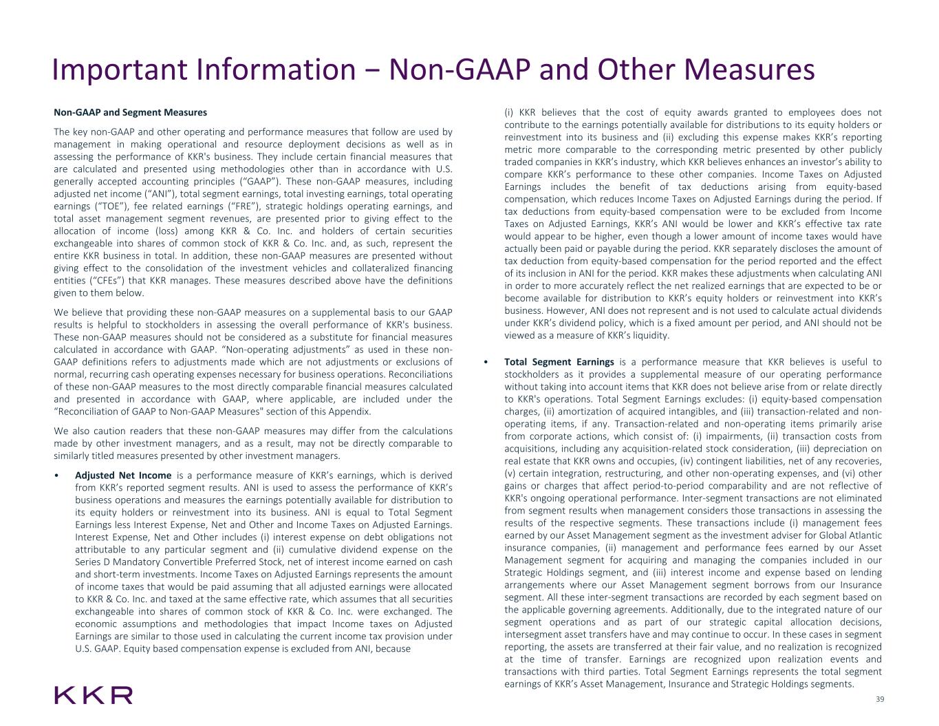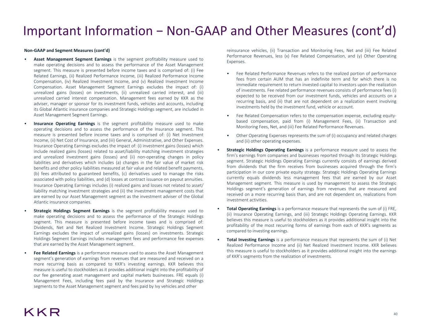 39 Important Information − Non-GAAP and Other Measures (i) KKR believes that the cost of equity awards granted to employees does not contribute to the earnings potentially available for distributions to its equity holders or reinvestment into its business and (ii) excluding this expense makes KKR’s reporting metric more comparable to the corresponding metric presented by other publicly traded companies in KKR’s industry, which KKR believes enhances an investor’s ability to compare KKR’s performance to these other companies. Income Taxes on Adjusted Earnings includes the benefit of tax deductions arising from equity-based compensation, which reduces Income Taxes on Adjusted Earnings during the period. If tax deductions from equity-based compensation were to be excluded from Income Taxes on Adjusted Earnings, KKR’s ANI would be lower and KKR’s effective tax rate would appear to be higher, even though a lower amount of income taxes would have actually been paid or payable during the period. KKR separately discloses the amount of tax deduction from equity-based compensation for the period reported and the effect of its inclusion in ANI for the period. KKR makes these adjustments when calculating ANI in order to more accurately reflect the net realized earnings that are expected to be or become available for distribution to KKR’s equity holders or reinvestment into KKR’s business. However, ANI does not represent and is not used to calculate actual dividends under KKR’s dividend policy, which is a fixed amount per period, and ANI should not be viewed as a measure of KKR’s liquidity. • Total Segment Earnings is a performance measure that KKR believes is useful to stockholders as it provides a supplemental measure of our operating performance without taking into account items that KKR does not believe arise from or relate directly to KKR's operations. Total Segment Earnings excludes: (i) equity-based compensation charges, (ii) amortization of acquired intangibles, and (iii) transaction-related and non- operating items, if any. Transaction-related and non-operating items primarily arise from corporate actions, which consist of: (i) impairments, (ii) transaction costs from acquisitions, including any acquisition-related stock consideration, (iii) depreciation on real estate that KKR owns and occupies, (iv) contingent liabilities, net of any recoveries, (v) certain integration, restructuring, and other non-operating expenses, and (vi) other gains or charges that affect period-to-period comparability and are not reflective of KKR's ongoing operational performance. Inter-segment transactions are not eliminated from segment results when management considers those transactions in assessing the results of the respective segments. These transactions include (i) management fees earned by our Asset Management segment as the investment adviser for Global Atlantic insurance companies, (ii) management and performance fees earned by our Asset Management segment for acquiring and managing the companies included in our Strategic Holdings segment, and (iii) interest income and expense based on lending arrangements where our Asset Management segment borrows from our Insurance segment. All these inter-segment transactions are recorded by each segment based on the applicable governing agreements. Additionally, due to the integrated nature of our segment operations and as part of our strategic capital allocation decisions, intersegment asset transfers have and may continue to occur. In these cases in segment reporting, the assets are transferred at their fair value, and no realization is recognized at the time of transfer. Earnings are recognized upon realization events and transactions with third parties. Total Segment Earnings represents the total segment earnings of KKR’s Asset Management, Insurance and Strategic Holdings segments. Non-GAAP and Segment Measures The key non-GAAP and other operating and performance measures that follow are used by management in making operational and resource deployment decisions as well as in assessing the performance of KKR's business. They include certain financial measures that are calculated and presented using methodologies other than in accordance with U.S. generally accepted accounting principles (“GAAP”). These non-GAAP measures, including adjusted net income (“ANI”), total segment earnings, total investing earnings, total operating earnings (“TOE”), fee related earnings (“FRE”), strategic holdings operating earnings, and total asset management segment revenues, are presented prior to giving effect to the allocation of income (loss) among KKR & Co. Inc. and holders of certain securities exchangeable into shares of common stock of KKR & Co. Inc. and, as such, represent the entire KKR business in total. In addition, these non-GAAP measures are presented without giving effect to the consolidation of the investment vehicles and collateralized financing entities (“CFEs”) that KKR manages. These measures described above have the definitions given to them below. We believe that providing these non-GAAP measures on a supplemental basis to our GAAP results is helpful to stockholders in assessing the overall performance of KKR's business. These non-GAAP measures should not be considered as a substitute for financial measures calculated in accordance with GAAP. “Non-operating adjustments” as used in these non- GAAP definitions refers to adjustments made which are not adjustments or exclusions of normal, recurring cash operating expenses necessary for business operations. Reconciliations of these non-GAAP measures to the most directly comparable financial measures calculated and presented in accordance with GAAP, where applicable, are included under the “Reconciliation of GAAP to Non-GAAP Measures" section of this Appendix. We also caution readers that these non-GAAP measures may differ from the calculations made by other investment m