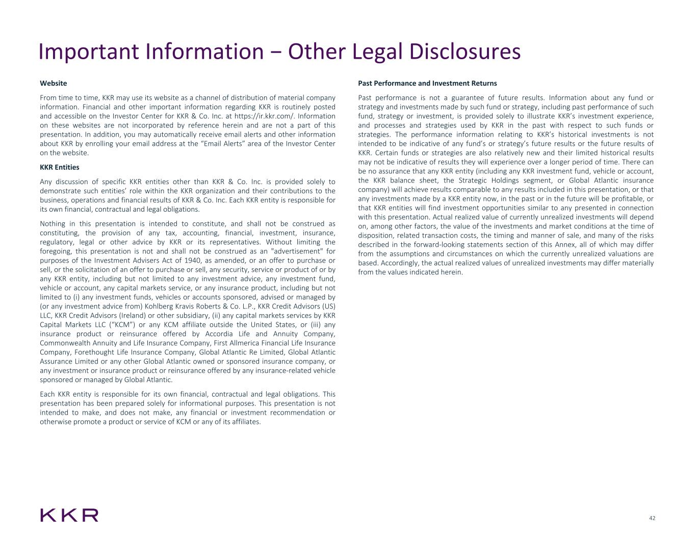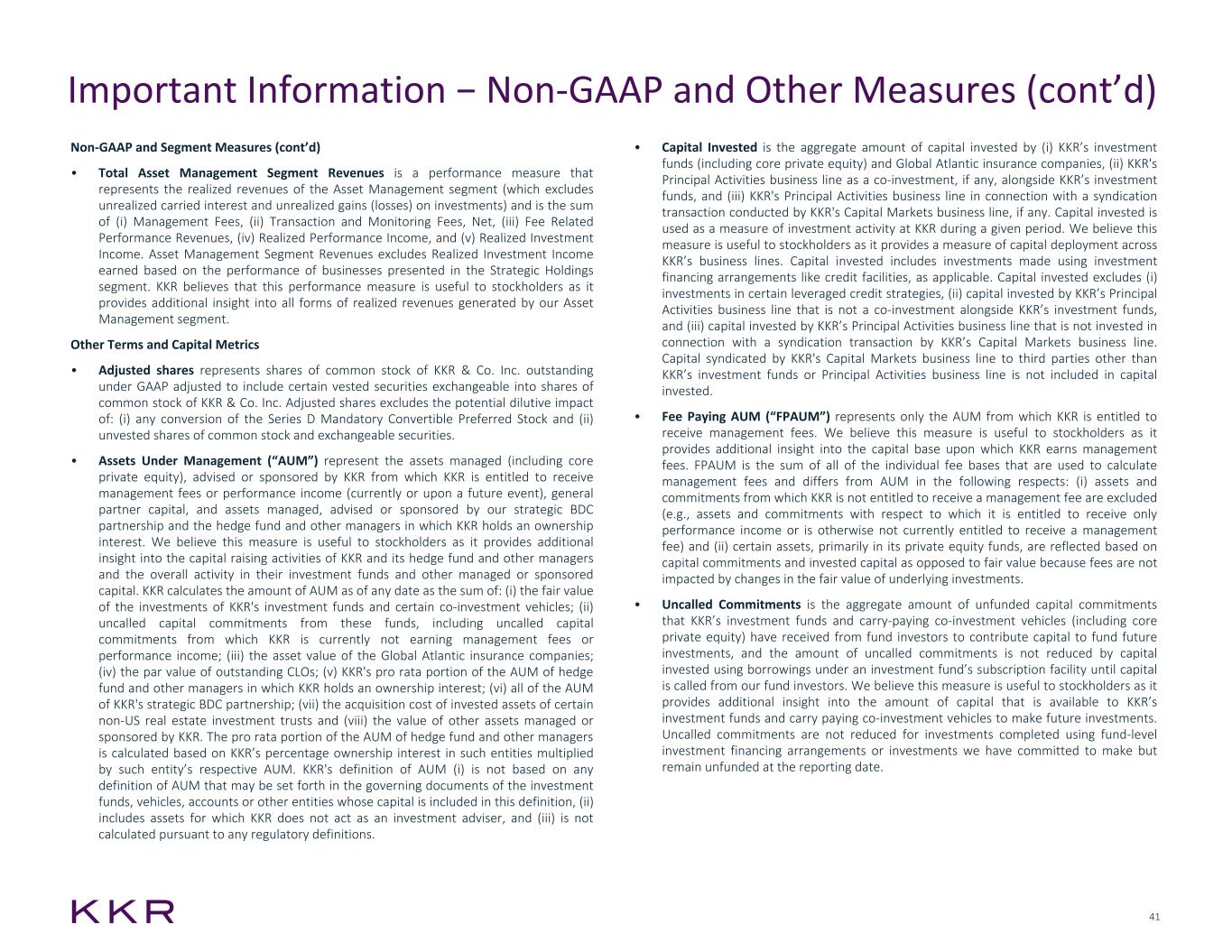 40 Non-GAAP and Segment Measures (cont’d) • Asset Management Segment Earnings is the segment profitability measure used to make operating decisions and to assess the performance of the Asset Management segment. This measure is presented before income taxes and is comprised of: (i) Fee Related Earnings, (ii) Realized Performance Income, (iii) Realized Performance Income Compensation, (iv) Realized Investment Income, and (v) Realized Investment Income Compensation. Asset Management Segment Earnings excludes the impact of: (i) unrealized gains (losses) on investments, (ii) unrealized carried interest, and (iii) unrealized carried interest compensation. Management fees earned by KKR as the adviser, manager or sponsor for its investment funds, vehicles and accounts, including its Global Atlantic insurance companies and Strategic Holdings segment, are included in Asset Management Segment Earnings. • Insurance Operating Earnings is the segment profitability measure used to make operating decisions and to assess the performance of the Insurance segment. This measure is presented before income taxes and is comprised of: (i) Net Investment Income, (ii) Net Cost of Insurance, and (iii) General, Administrative, and Other Expenses. Insurance Operating Earnings excludes the impact of: (i) investment gains (losses) which include realized gains (losses) related to asset/liability matching investment strategies and unrealized investment gains (losses) and (ii) non-operating changes in policy liabilities and derivatives which includes (a) changes in the fair value of market risk benefits and other policy liabilities measured at fair value and related benefit payments, (b) fees attributed to guaranteed benefits, (c) derivatives used to manage the risks associated with policy liabilities, and (d) losses at contract issuance on payout annuities. Insurance Operating Earnings includes (i) realized gains and losses not related to asset/ liability matching investment strategies and (ii) the investment management costs that are earned by our Asset Management segment as the investment adviser of the Global Atlantic insurance companies. • Strategic Holdings Segment Earnings is the segment profitability measure used to make operating decisions and to assess the performance of the Strategic Holdings segment. This measure is presented before income taxes and is comprised of: Dividends, Net and Net Realized Investment Income. Strategic Holdings Segment Earnings excludes the impact of unrealized gains (losses) on investments. Strategic Holdings Segment Earnings includes management fees and performance fee expenses that are earned by the Asset Management segment. • Fee Related Earnings is a performance measure used to assess the Asset Management segment’s generation of earnings from revenues that are measured and received on a more recurring basis as compared to KKR’s investing earnings. KKR believes this measure is useful to stockholders as it provides additional insight into the profitability of our fee generating asset management and capital markets businesses. FRE equals (i) Management Fees, including fees paid by the Insurance and Strategic Holdings segments to the Asset Management segment and fees paid by Ivy vehicles and other Important Information − Non-GAAP and Other Measures (cont’d) reinsurance vehicles, (ii) Transaction and Monitoring Fees, Net and (iii) Fee Related Performance Revenues, less (x) Fee Related Compensation, and (y) Other Operating Expenses. • Fee Related Performance Revenues refers to the realized portion of performance fees from certain AUM that has an indefinite term and for which there is no immediate requirement to return invested capital to investors upon the realization of investments. Fee related performance revenues consists of performance fees (i) expected to be received from our investment funds, vehicles and accounts on a recurring basis, and (ii) that are not dependent on a realization event involving investments held by the investment fund, vehicle or account. • Fee Related Compensation refers to the compensation expense, excluding equity- based compensation, paid from (i) Management Fees, (ii) Transaction and Monitoring Fees, Net, and (iii) Fee Related Performance Revenues. • Other Operating Expenses represents the sum of (i) occupancy and related charges and (ii) other operating expenses. • Strategic Holdings Operating Earnings is a performance measure used to assess the firm’s earnings from companies and businesses reported through its Strategic Holdings segment. Strategic Holdings Operating Earnings currently consists of earnings derived from dividends that the firm receives from businesses acquired through the firm’s participation in our core private equity strategy. Strategic Holdings Operating Earnings currently equals dividends less management fees that are earned by our Asset Management segment. This measure is used by management to assess the Strategic Holdings segment’s generation of earnings from revenues that are measured and received on a more recurring basis than, and are not dependent on, realizations from investment activities. • Total Operating Earnings is a performance measure that represents the sum of (i) FRE, (ii) Insurance Operating Earnings, and (iii) Strategic Holdings Operating Earnings. KKR believes this measure is useful to stockholders as it provides additional insight into the profitability of the most recurring forms of earnings from each of KKR’s segments as compared to investing earnings. • Total Investing Earnings is a performance measure that represents the sum of (i) Net Realized Performance Income and (ii) Net Realized Investment Income. KKR believes this measure is useful to stockholders as it provides additional insight into the earnings of KKR’s segments from the realization of investments.