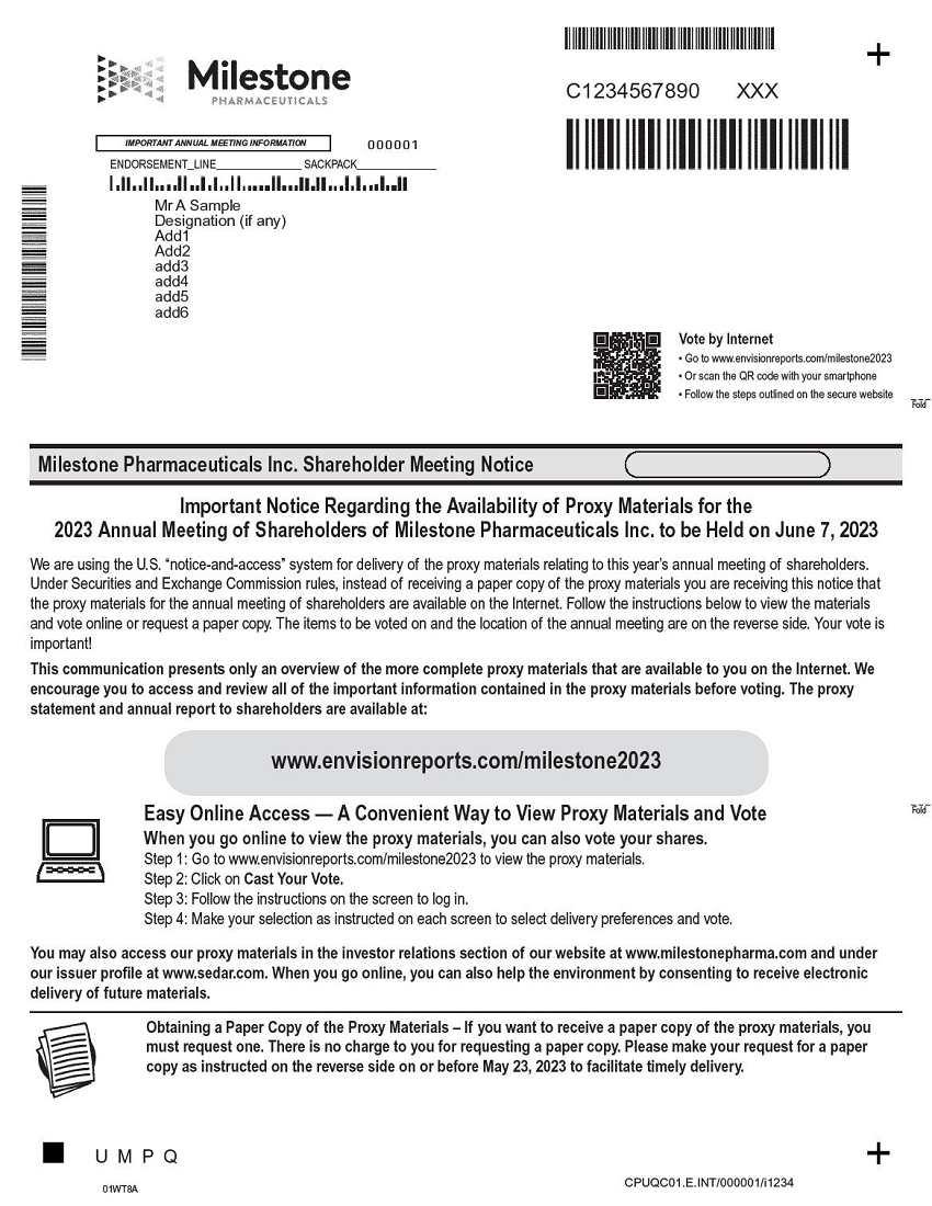 C1234567890 XXXIMPORTANT ANNUAL MEETING INFORMATION000001ENDORSEMENT_LINE SACKPACKMr A Sample Designation (if any) Add1 Add2 add3 add4 add5 add6Vote by Internet • Go to www.envisionreports.com/milestone2023 • Or scan the QR code with your smartphone • Follow the steps outlined on the secure website FoldMilestone Pharmaceuticals Inc. Shareholder Meeting Notice Important Notice Regarding the Availability of Proxy Materials for the 2023 Annual Meeting of Shareholders of Milestone Pharmaceuticals Inc. to be Held on June 7, 2023 We are using the U.S. “notice-and-access” system for delivery of the proxy materials relating to this year’s annual meeting of shareholders. Under Securities and Exchange Commission rules, instead of receiving a paper copy of the proxy materials you are receiving this notice that the proxy materials for the annual meeting of shareholders are available on the Internet. Follow the instructions below to view the materials and vote online or request a paper copy. The items to be voted on and the location of the annual meeting are on the reverse side. Your vote is important! This communication presents only an overview of the more complete proxy materials that are available to you on the Internet. We encourage you to access and review all of the important information contained in the proxy materials before voting. The proxy statement and annual report to shareholders are available at:www.envisionreports.com/milestone2023Easy Online Access — A Convenient Way to View Proxy Materials and Vote When you go online to view the proxy materials, you can also vote your shares. Step 1: Go to www.envisionreports.com/milestone2023 to view the proxy materials. Step 2: Click on Cast Your Vote. Step 3: Follow the instructions on the screen to log in. Step 4: Make your selection as instructed on each screen to select delivery preferences and vote. You may also access our proxy materials in the investor relations section of our website at www.milestonepharma.com and under our issuer profile at www.sedar.com. When you go online, you can also help the environment by consenting to receive electronic delivery of future materials. Obtaining a Paper Copy of the Proxy Materials – If you want to receive a paper copy of the proxy materials, you must request one. There is no charge to you for requesting a paper copy. Please make your request for a paper copy as instructed on the reverse side on or before May 23, 2023 to facilitate timely delivery.FoldU M P Q 01WT8ACPUQC01.E.INT/000001/i1234
