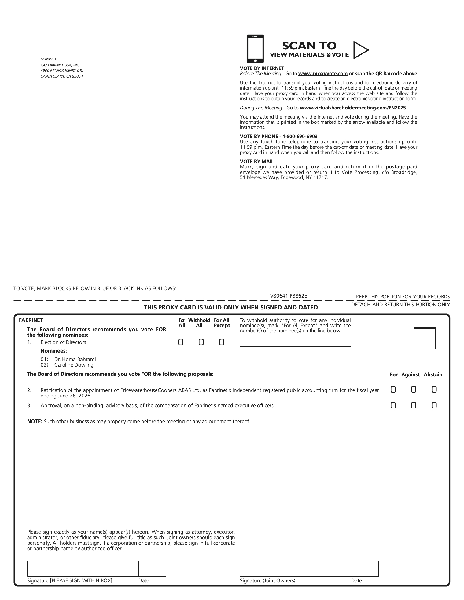 | Ratify the appointment of PricewaterhouseCoopers ABAS Ltd. as Fabrinet’s independent registered public accounting firm for Fabrinet’s fiscal year ending June 26, 2026; |