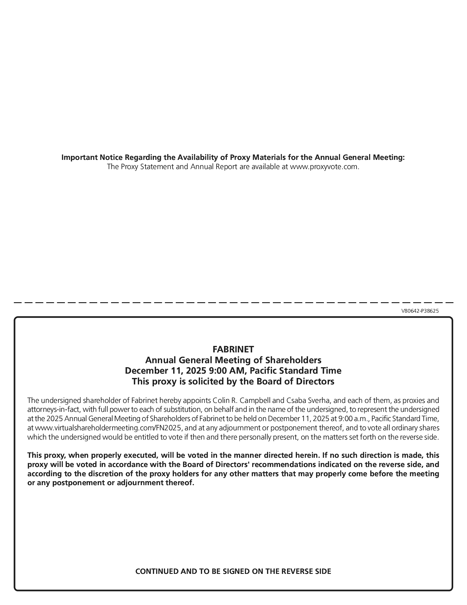 In the event of a technical malfunction or other situation that at the discretion of the Chairman of the Board of Directors may affect the ability of the Annual Meeting to satisfy the requirements for a meeting of shareholders to be held, the Chairman or Corporate Secretary of Fabrinet will convene the meeting at 11:00 a.m. Pacific Standard Time on the same date and at the website specified above solely for the purpose of holding the adjourned meeting at this later time.