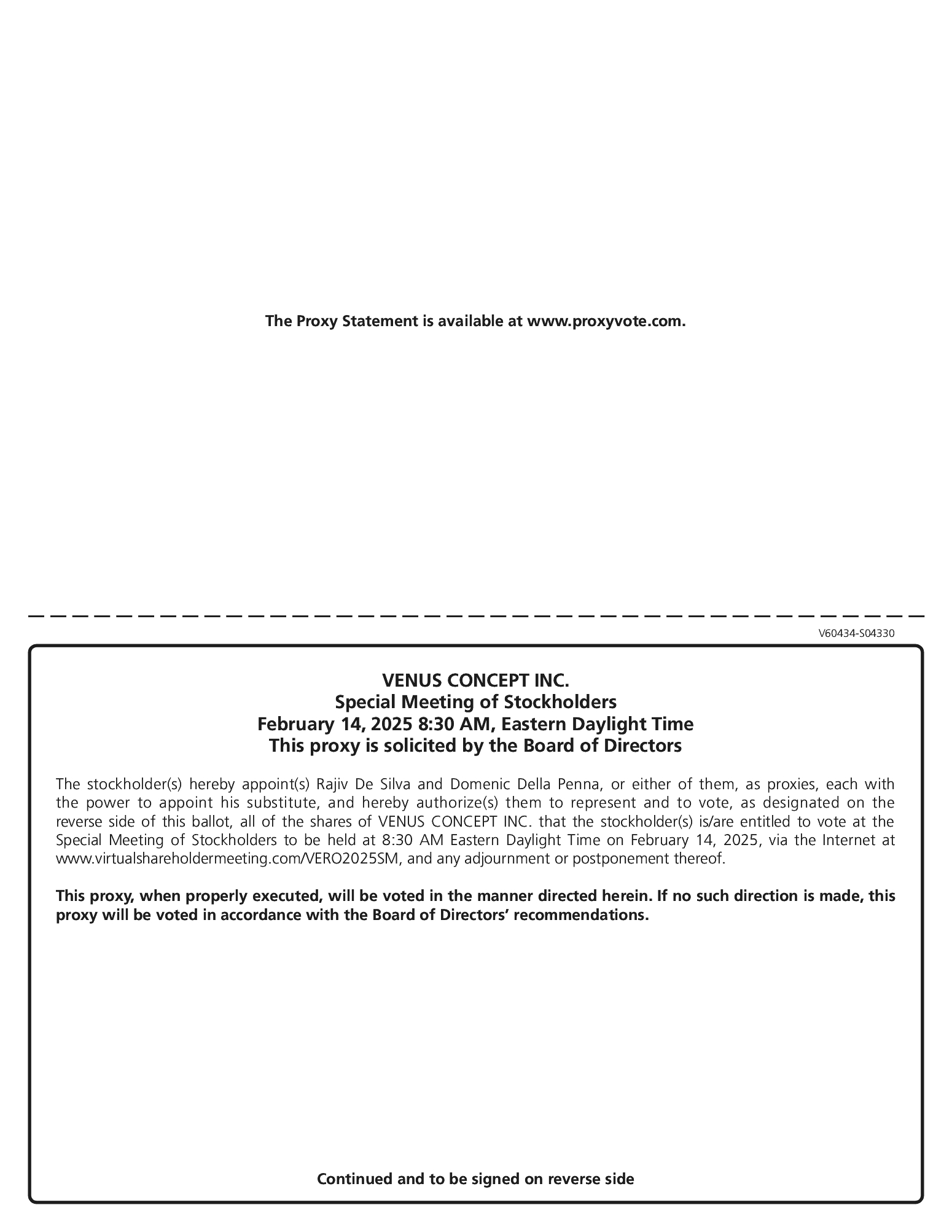 We have sent you this Proxy Statement and the enclosed Proxy Card because the board of directors of Venus Concept Inc. (referred to herein as the “Company,” “Venus Concept,” “we,” “us” or “our”) is soliciting your proxy to vote at our Special Meeting of Stockholders (the “Special Meeting”) to be held on Friday, February 14, 2025, at 8:30 a.m. Eastern Standard Time. The Special Meeting can be accessed by visiting http://www.virtualshareholdermeeting.com/VERO2025SM, where you will be able to listen to the meeting live, submit questions and vote online.