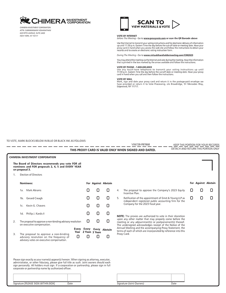It is my pleasure to invite you to attend the 2023 annual meeting of stockholders (the “Annual Meeting”) of Chimera Investment Corporation, a Maryland corporation (“Chimera” or “the Company”), that will be held on June 14, 2023, at 10:00 a.m., Eastern Time.