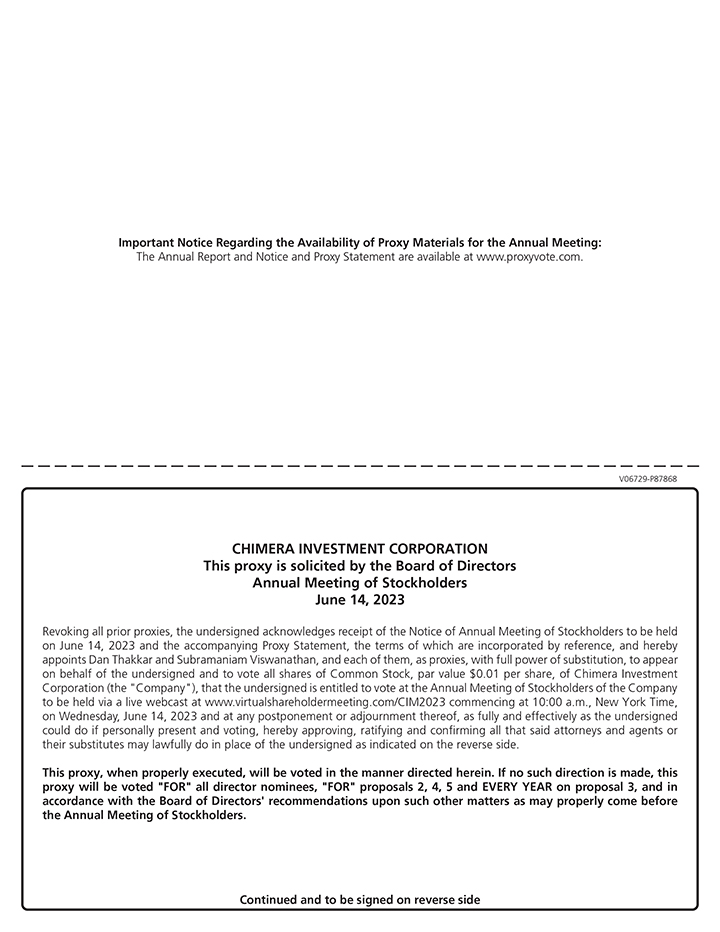 These materials are intended to solicit proxies on behalf of the Board of Directors of Chimera Investment Corporation, a Maryland corporation (which we refer to as “Chimera,” the “Company,” “we,” or “us”), for the 2023 annual meeting of stockholders (“Annual Meeting”), including any adjournment or postponement thereof. This year, the Annual Meeting will once again be a virtual meeting of stockholders. This means you will be able to attend the Annual Meeting, vote and submit questions during the Annual Meeting via a live webcast by visiting www.virtualshareholdermeeting.com/CIM2023. The meeting will convene at 10:00 a.m. Eastern Time on June 14, 2023.