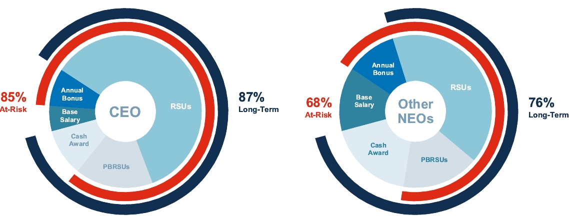 Typically, long-term awards comprise the single biggest component of target total direct compensation for our NEOs. This approach aligns our executive team with our stockholders’ long-term interests, attracts executives of the highest caliber and retains them for the long term. In granting annual long-term awards, the Compensation Committee considers, among other things, the executive officer’s base compensation and bonus opportunity, the need to create a meaningful opportunity for reward predicated on the creation of long-term stockholder value, our financial results, market conditions and an evaluation of the expected and actual responsibilities and performance.