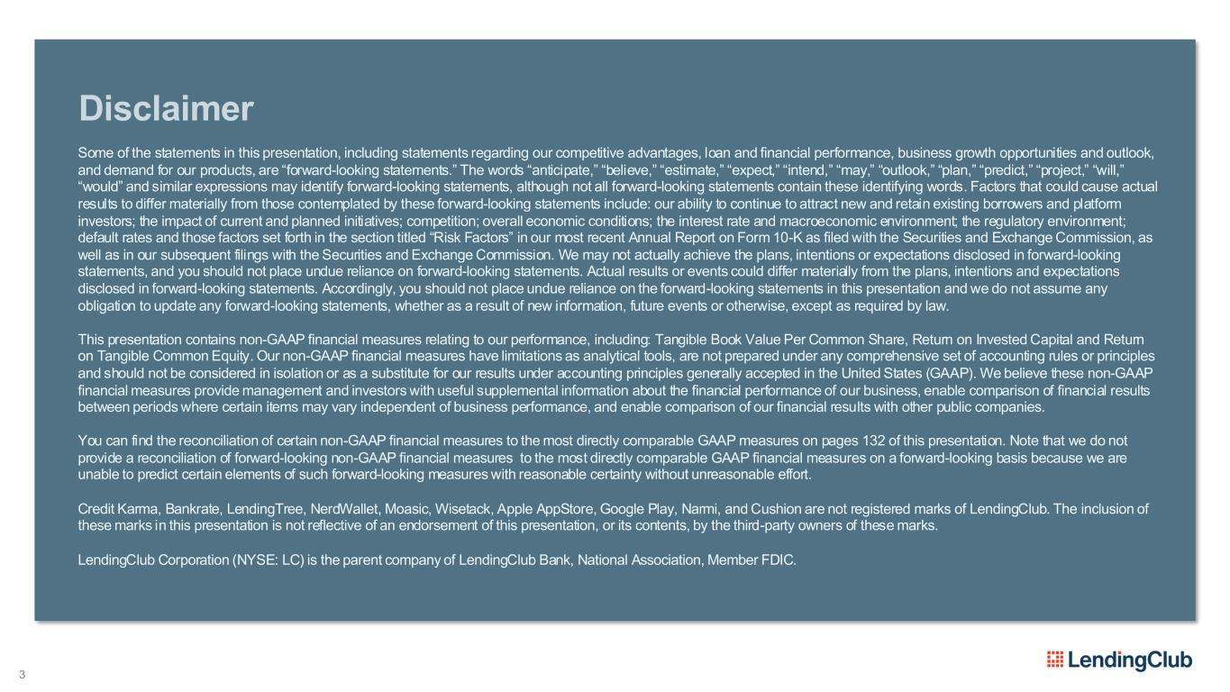 2 9:05-9:25 WELCOME SCOTT SANBORN, CHIEF EXECUTIVE OFFICER 9:25-9:45 CREDIT KIRAN AWARE, HEAD OF CREDIT STRATEGY & PRICING 9:45-10:05 LENDING STEVE MATTICS, CHIEF LENDING OFFICER 10:05-10:25 ENGAGEMENT MARK ELLIOT, CHIEF CUSTOMER OFFICER 10:25-10:35 Questions & Answers 10:35-10:50 BREAK 10:50-11:10 TECHNOLOGY LUKASZ STROZEK, CHIEF TECHNOLOGY OFFICER 11:10-11:30 OUR MODEL DREW LABENNE, CHIEF FINANCIAL OFFICER 11:30-11:55 MARKETPLACE INVESTOR PANEL CLARKE ROBERTS, GM OF MARKETPLACE 11:55-12:30 LUNCH 12:30-12:50 FINANCIALS DREW LABENNE, CHIEF FINANCIAL OFFICER 12:50-1:20 Questions & Answers 1:20-1:30 CLOSE SCOTT SANBORN, CHIEF EXECUTIVE OFFICER Agenda