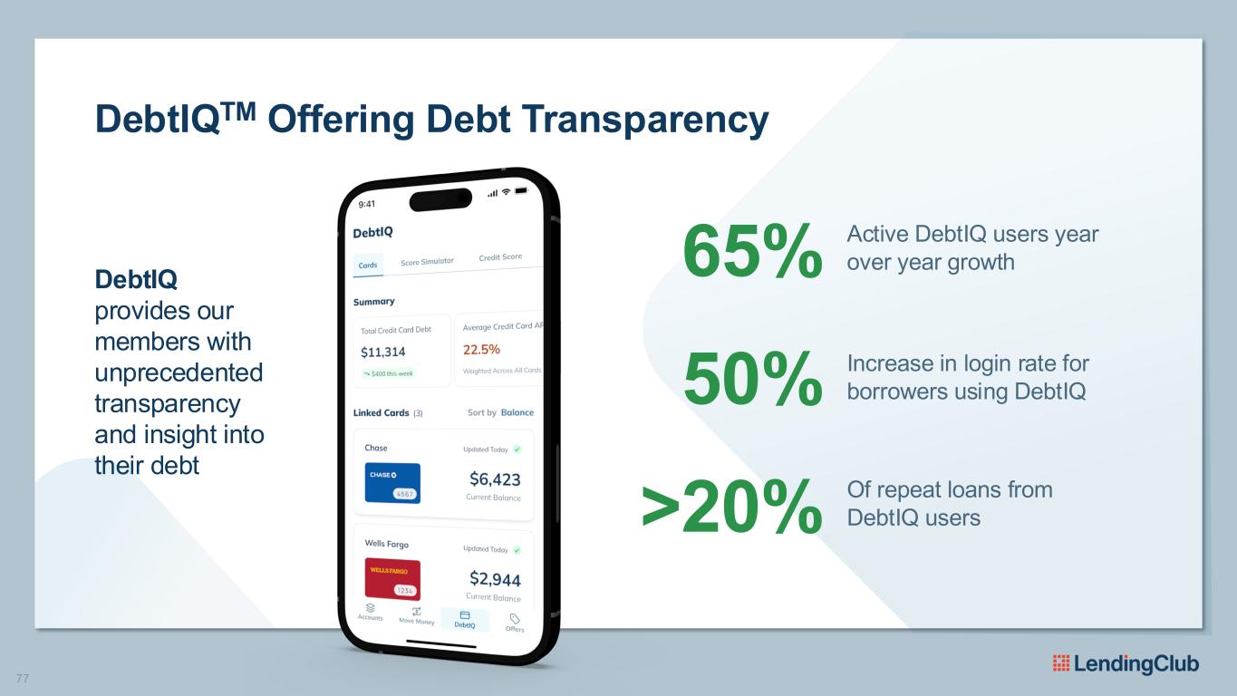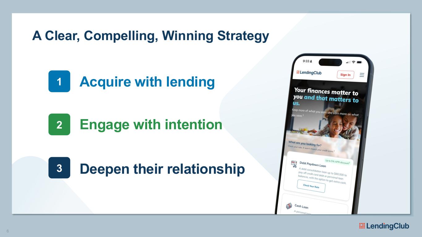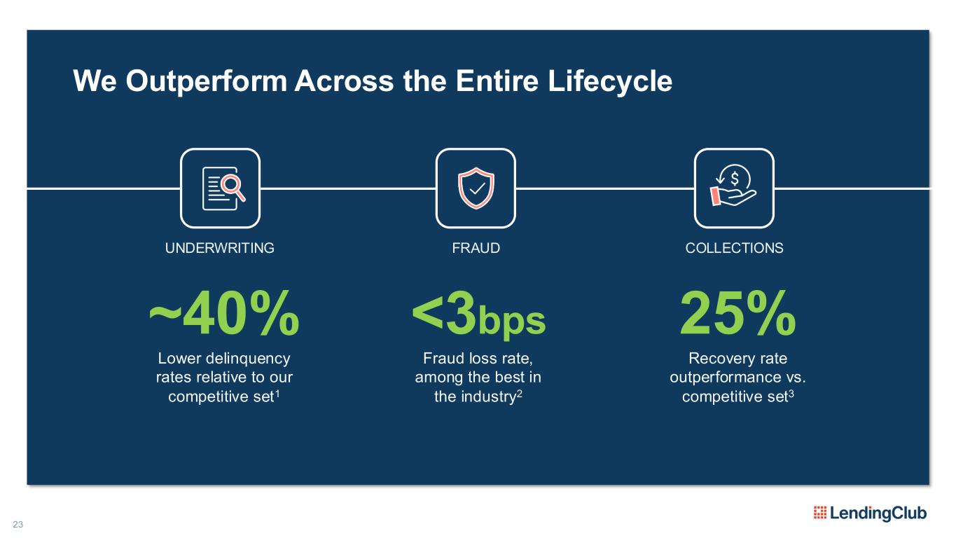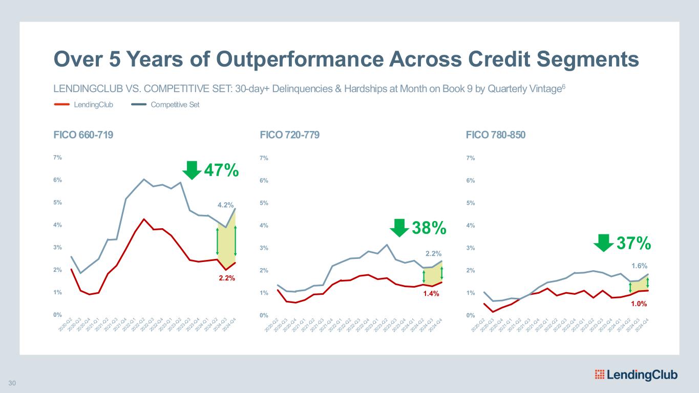 134 Footnotes An Unmatched Underwriting Advantage (continued) 5. LendingClub application data from Q1-Q3’23 that consists of borrowers who had been issued loans from LendingClub or similar lenders within 3 months of their LC applications. Default is defined as missing two or more payments or charged- off within the first 12 months post issuance. 6. This data is provided by dv01 to be used for informational purposes only. dv01 is not liable for use of this data. The data is the property and confidential information of dv01. Distribution outside of this presentation is prohibited. Delinquencies include 30+ day delinquencies for each respective quarterly vintage at month on book 9, including loans that are actively in hardship plans. Numbers quoted are an average of the most recent 3 quarterly vintages. There may be differences in the outperformance calculations due to rounding. Competitor set includes information with respect to marketplace lenders and direct competitors as reported by dv01's Marketplace Personal Loan benchmarking data as of end-of-month August 2025. 7. Did Fintech Loans Default More During the COVID-19 Pandemic? Were Fintech Firms “Cream Skimming” the Best Borrowers? Federal Reserve Bank of Philadelphia, November 2023. 8. LendingClub early-stage roll rates from 2021 to 2025 compared to dv01 Unsecured Consumer Lending benchmark, performance month as of August 31, 2025. 9. LendingClub internal data as of September 30, 2025. 10. LendingClub recovery rate at MOB24 compared to dv01 Unsecured Consumer Lending benchmark from 2019-2023 charge-off vintages, performance month as of August 31, 2025. Products that Attract Members for Life 1. Total outstanding revolving credit card debt, 2025 Credit Card Debt Statistics, LendingTree, October 9, 2025. 2. St. Louis Federal Reserve, Commercial Bank Interest Rate on Credit Card Plans, Accounts Assessed Interest, October 7, 2025. 3. LendingClub internal data as of September 30, 2025. 4. St. Louis Federal Reserve, Commercial Bank Interest Rate on Credit Card Plans, Accounts Assessed Interest, October 7, 2025. Average LendingClub personal loan APR represents current internal estimates across 2024 and 2025 originations. 5. Between Jan 2025 to March 2025, borrowers who paid their creditors directly by LendingClub Bank to refinance at least 51% of their qualifying debt within the first three months of taking out a personal loan from LendingClub Bank saw an average FICO score increase of 35 points. Individual results are not guaranteed and vary based on multiple factors, including but not limited to payment history and credit utilization. 6. LendingClub internal data as of September 1, 2025.