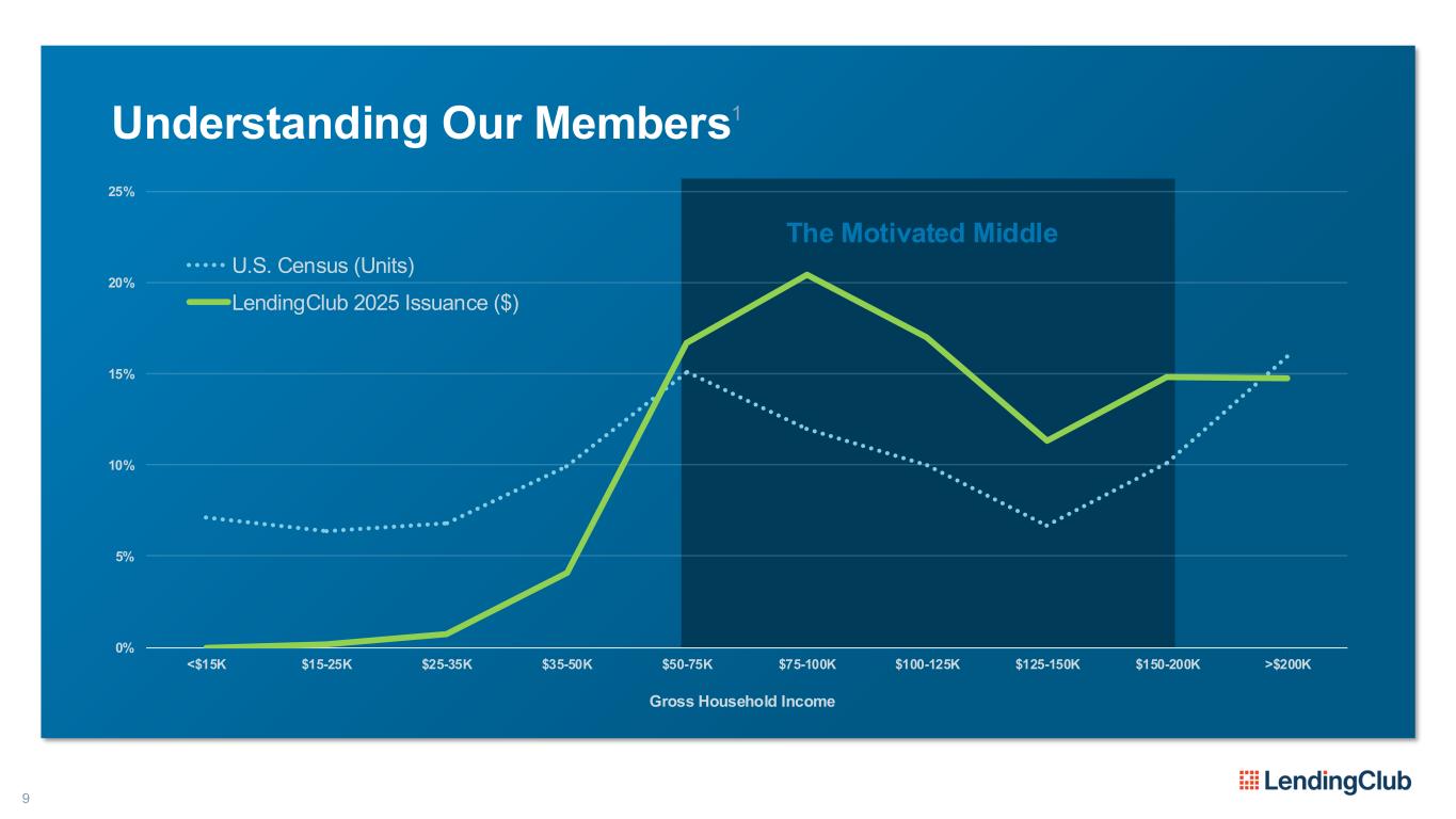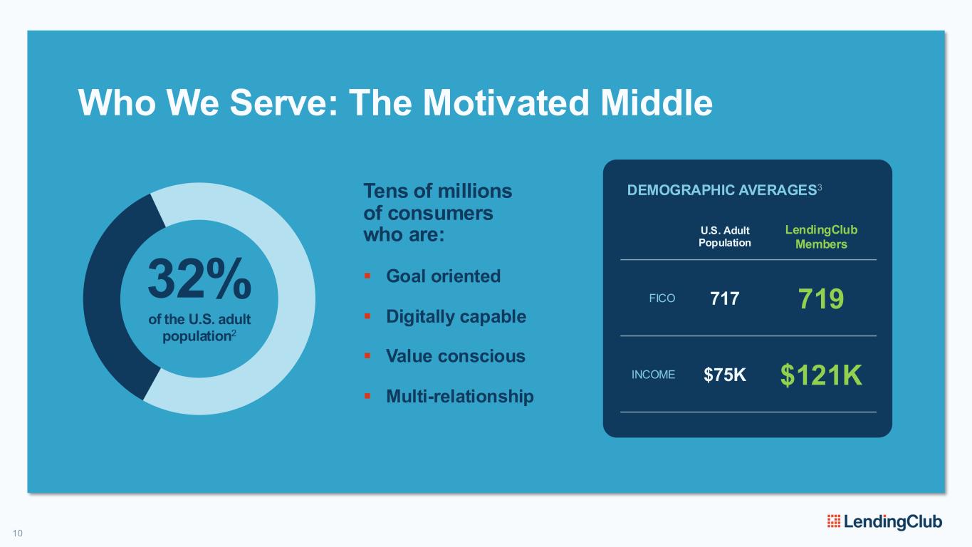 9 Understanding Our Members1 0% 5% 10% 15% 20% 25% <$15K $15-25K $25-35K $35-50K $50-75K $75-100K $100-125K $125-150K $150-200K >$200K Gross Household Income U.S. Census (Units) LendingClub 2025 Issuance ($) The Motivated Middle