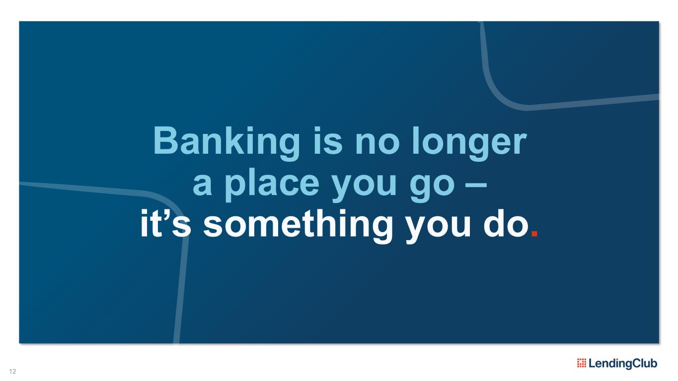 11 The Motivated Middle: High Income, High Credit Usage BORROWING5 Category Percentage of LendingClub Members LendingClub Members vs. U.S. Adult Population Credit Card 99% +29% Private Label Credit Card 77% +42% Auto (non-LendingClub) 62% +36% Mortgage 47% +23% Student Loan 31% +18% 45% Our target market holds 45% of U.S. non-mortgage debt4