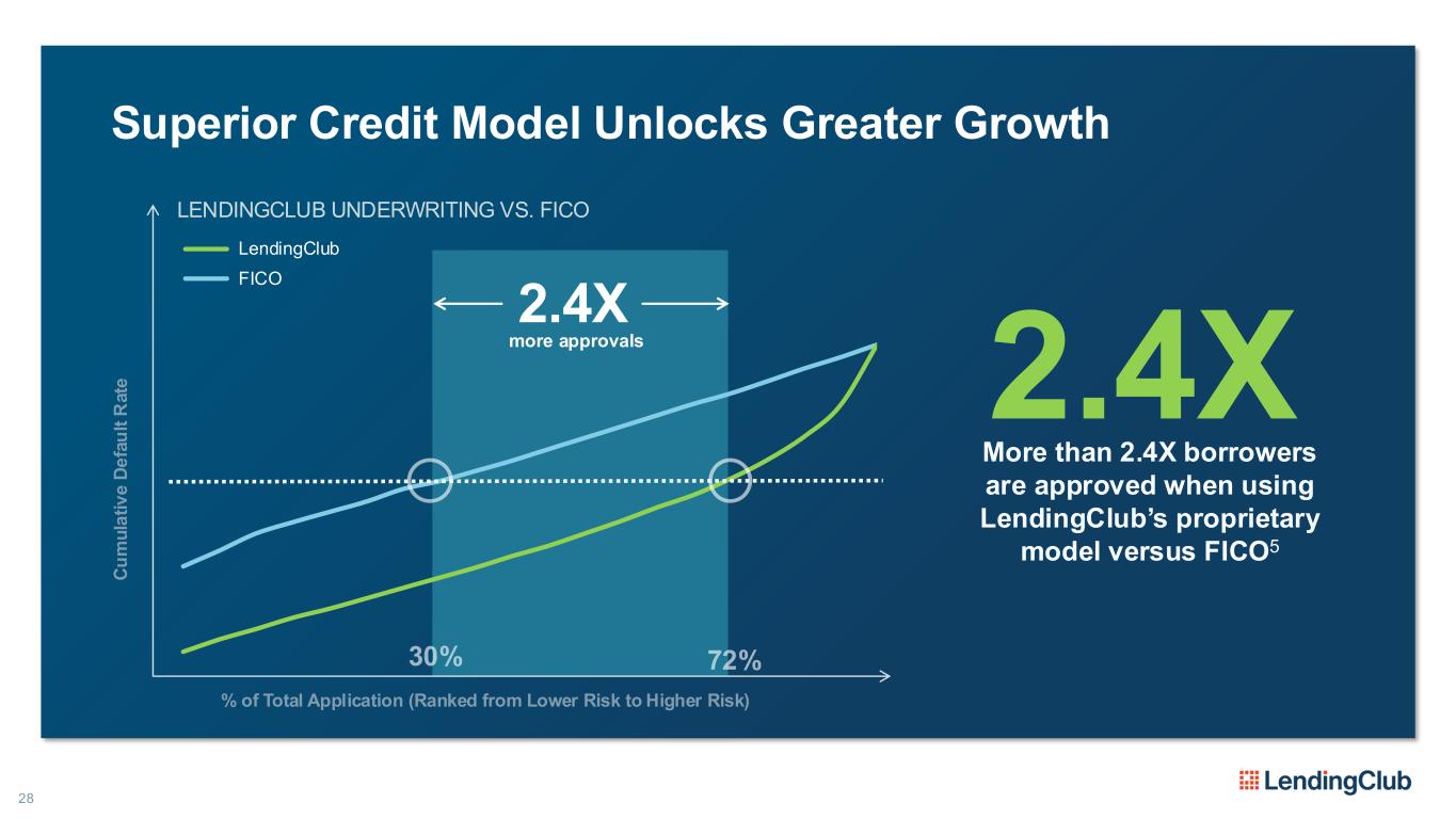 Able to accurately identify high risk behavior Able to identify superior quality borrowers and offer them better pricing Outperforming FICO with Advanced Underwriting LendingClub’s Proprietary Risk Score FICO LENDINGCLUB UNDERWRITING VS. FICO 12X LendingClub Model’s Discerning Power vs. FICO4 Lower Risk Higher Risk P ro je c te d D e fa u lt R a te 27