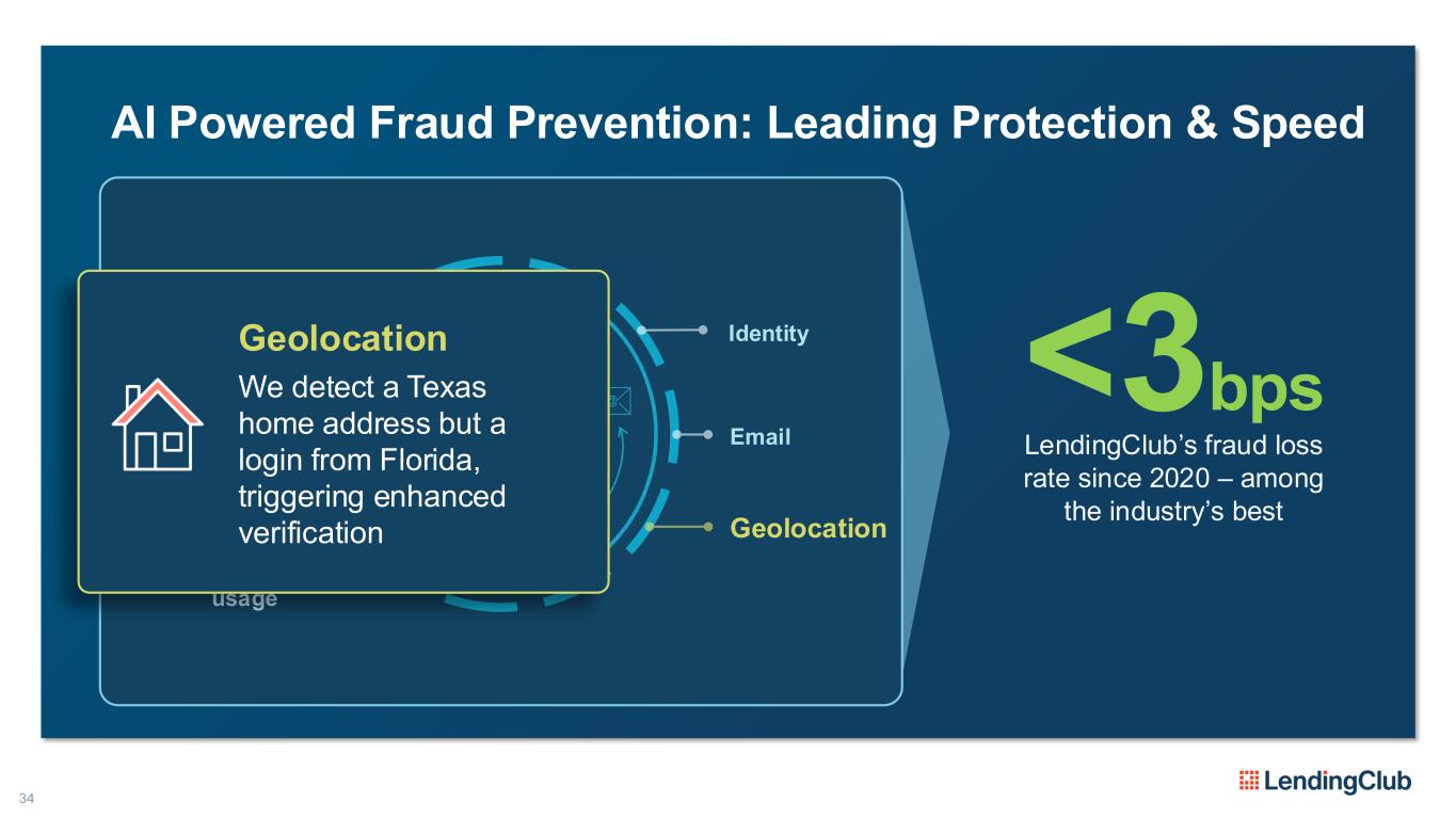 33 AI Powered Fraud Prevention: Leading Protection & Speed <3bps LendingClub’s fraud loss rate since 2020 – among the industry’s best Device identity Login behavior Bank patterns Geolocation Card usage Identity Email<1 sec Login Behavior Multiple logins from the same device fingerprint or correlated IP subnet, flagging potential synthetic fraud rings