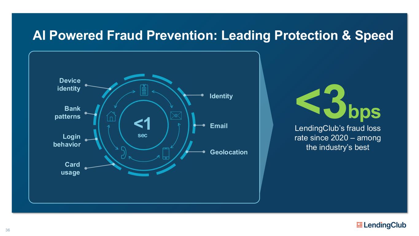 35 AI Powered Fraud Prevention: Leading Protection & Speed <3bps LendingClub’s fraud loss rate since 2020 – among the industry’s best Device identity Login behavior Bank patterns Geolocation Card usage Identity Email<1 sec Email Detect new and suspicious email patterns through domain age, usage history, and digital activity