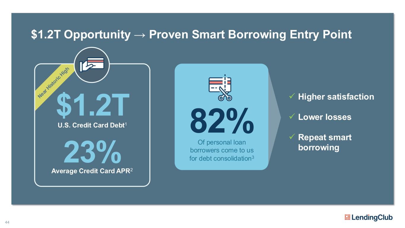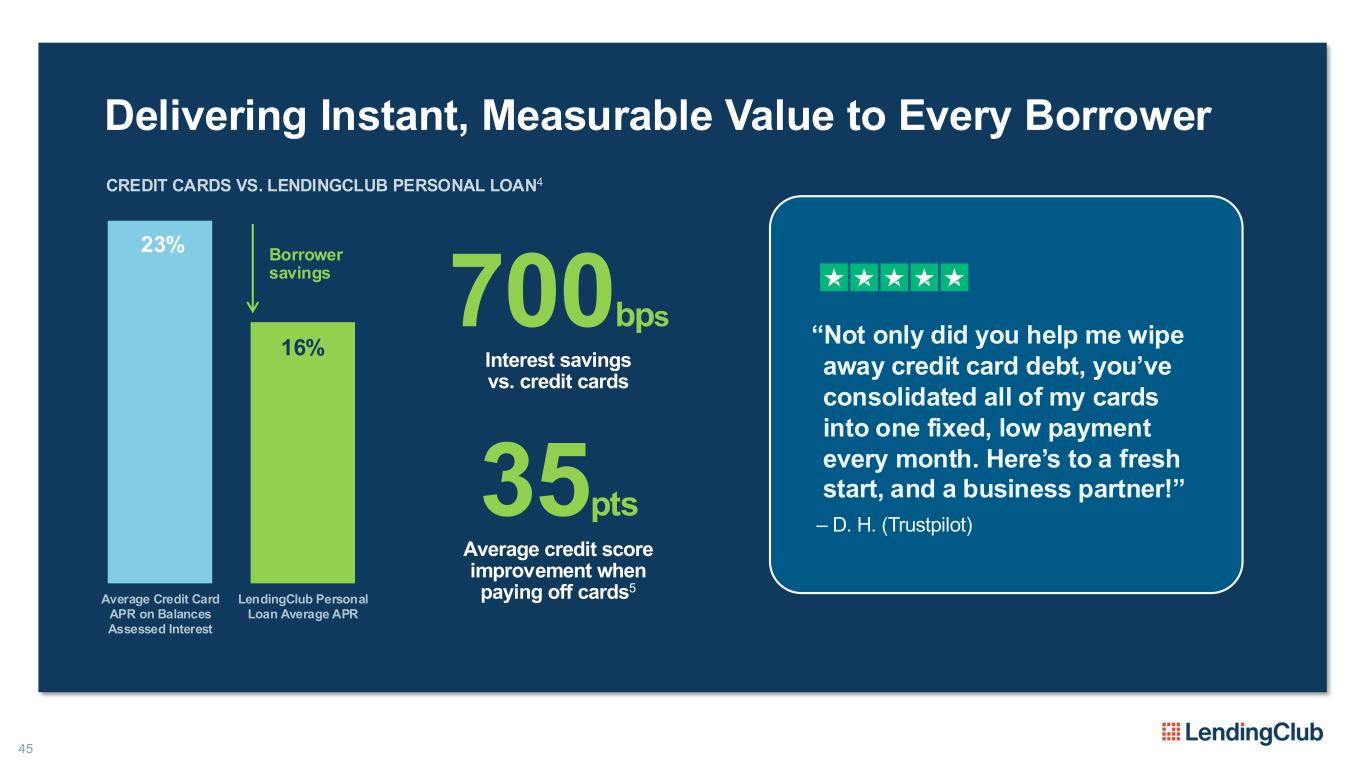 44 $1.2T Opportunity → Proven Smart Borrowing Entry Point U.S. Credit Card Debt1 $1.2T 82% Of personal loan borrowers come to us for debt consolidation3 ✓ Higher satisfaction ✓ Lower losses ✓ Repeat smart borrowing Average Credit Card APR2 23%
