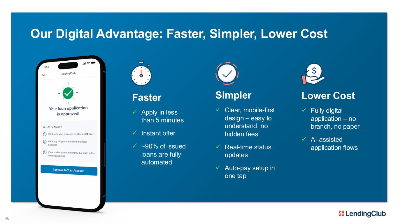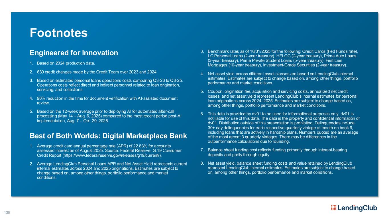 136 Footnotes Engineered for Innovation 1. Based on 2024 production data. 2. 630 credit changes made by the Credit Team over 2023 and 2024. 3. Based on estimated personal loans operations costs comparing Q3-23 to Q3-25. Operations costs reflect direct and indirect personnel related to loan origination, servicing, and collections. 4. 96% reduction in the time for document verification with AI-assisted document review. 5. Based on the 12-week average prior to deploying AI for automated after-call processing (May 14 – Aug. 6, 2025) compared to the most recent period post-AI implementation, Aug. 7 – Oct. 29, 2025. Best of Both Worlds: Digital Marketplace Bank 1. Average credit card annual percentage rate (APR) of 22.83% for accounts assessed interest as of August 2025. Source: Federal Reserve, G.19 Consumer Credit Report (https://www.federalreserve.gov/releases/g19/current/). 2. Average LendingClub Personal Loans APR and Net Asset Yield represents current internal estimates across 2024 and 2025 originations. Estimates are subject to change based on, among other things, portfolio performance and market conditions. 3. Benchmark rates as of 10/31/2025 for the following: Credit Cards (Fed Funds rate), LC Personal Loans (2-year treasury), HELOC (2-year treasury), Prime Auto Loans (3-year treasury), Prime Private Student Loans (5-year treasury), First Lien Mortgages (10-year treasury), Investment-Grade Securities (2-year treasury). 4. Net asset yield across different asset classes are based on LendingClub internal estimates. Estimates are subject to change based on, among other things, portfolio performance and market conditions. 5. Coupon, origination fee, acquisition and servicing costs, annualized net credit losses, and net asset yield represent LendingClub’s internal estimates for personal loan originations across 2024–2025. Estimates are subject to change based on, among other things, portfolio performance and market conditions. 6. This data is provided by dv01 to be used for informational purposes only. dv01 is not liable for use of this data. The data is the property and confidential information of dv01. Distribution outside of this presentation is prohibited. Delinquencies include 30+ day delinquencies for each respective quarterly vintage at month on book 9, including loans that are actively in hardship plans. Numbers quoted are an average of the most recent 3 quarterly vintages. There may be differences in the outperformance calculations due to rounding. 7. Balance sheet funding cost reflects funding primarily through interest-bearing deposits and partly through equity. 8. Net asset yield, balance sheet funding costs and value retained by LendingClub represent LendingClub internal estimates. Estimates are subject to change based on, among other things, portfolio performance and market conditions.