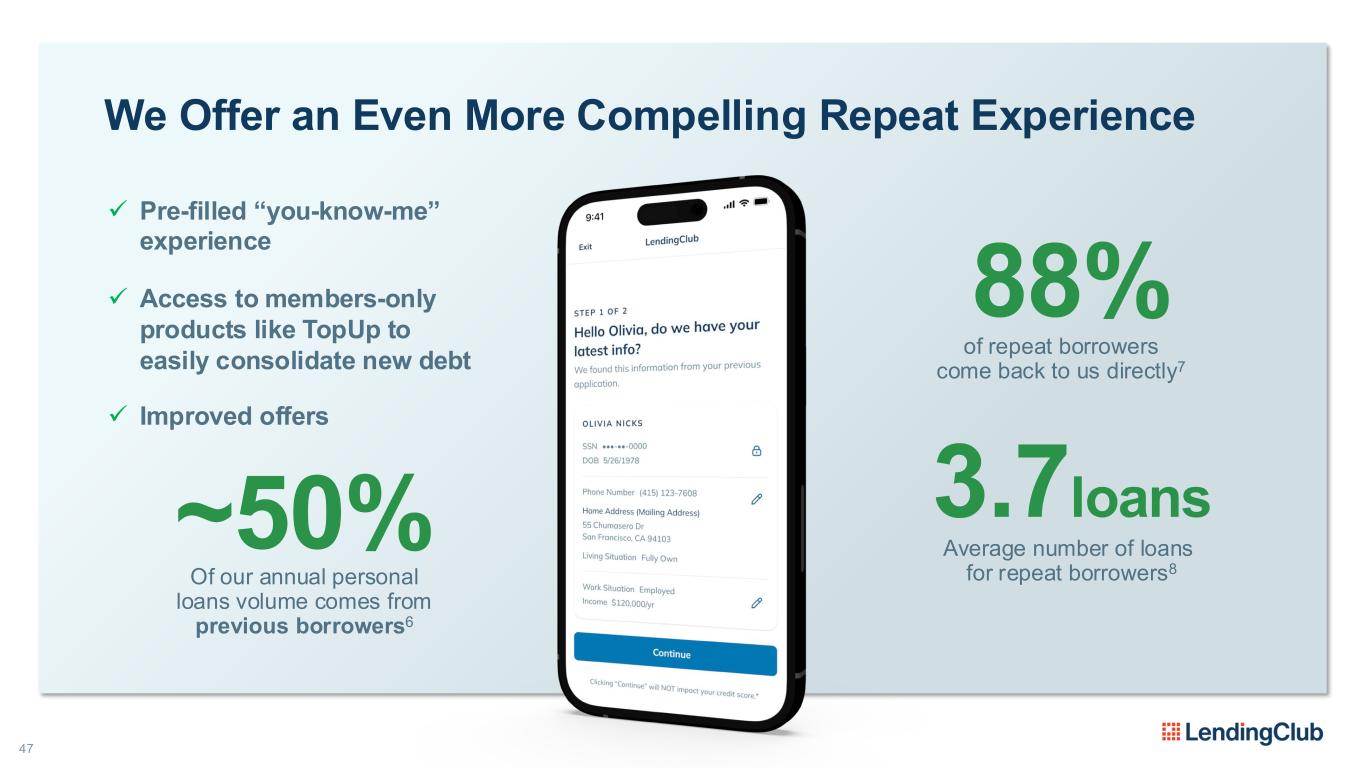 47 We Offer an Even More Compelling Repeat Experience ~50% Of our annual personal loans volume comes from previous borrowers6 3.7loans Average number of loans for repeat borrowers8 ✓ Pre-filled “you-know-me” experience ✓ Access to members-only products like TopUp to easily consolidate new debt ✓ Improved offers of repeat borrowers come back to us directly7 88%