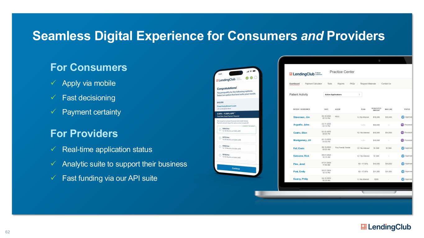 Leveraging Our Unmatched Underwriting Advantage 61 CASE STUDY LendingClub vs. Competitor 77% Of offers were won by LendingClub ✓ Lower Payment ✓ Higher Approval Rates