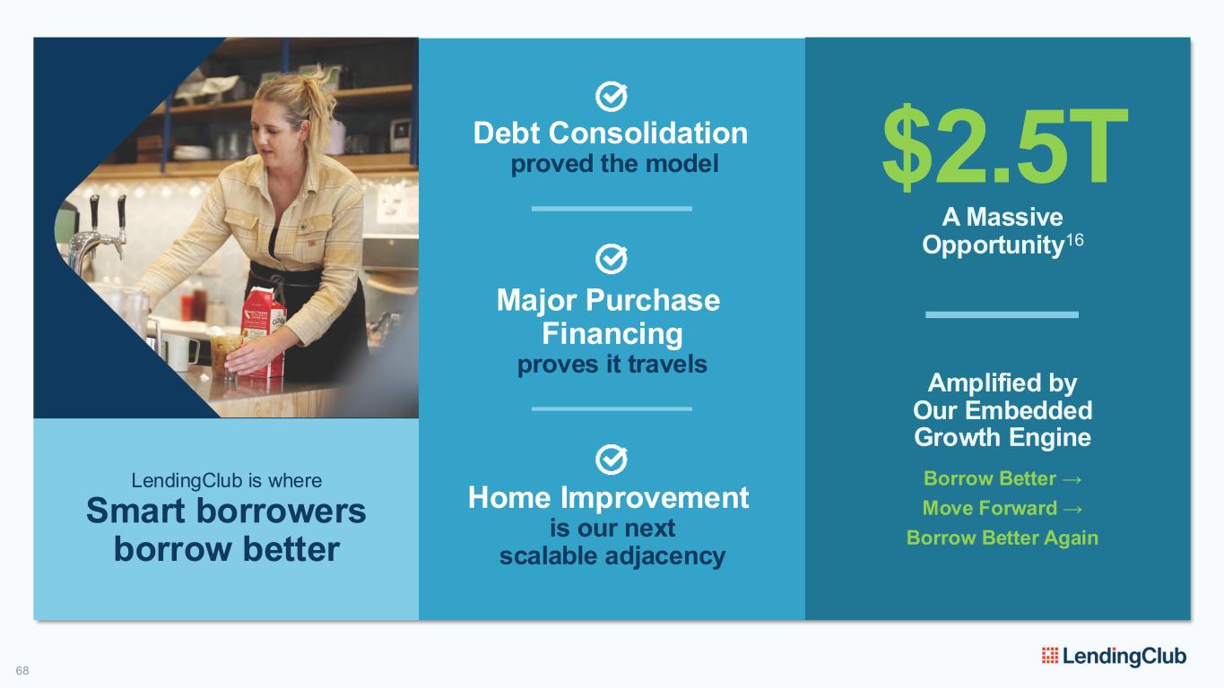 68 LendingClub is where Smart borrowers borrow better Debt Consolidation proved the model Home Improvement is our next scalable adjacency Major Purchase Financing proves it travels Amplified by Our Embedded Growth Engine Borrow Better → Move Forward → Borrow Better Again A Massive Opportunity16 $2.5T