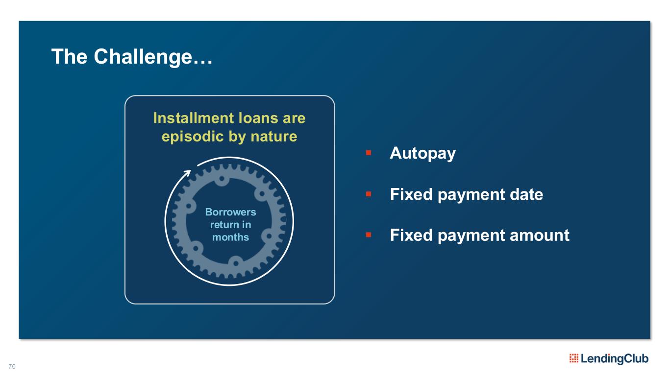 Borrowers return in months Installment loans are episodic by nature The Challenge… ▪ Autopay ▪ Fixed payment date ▪ Fixed payment amount 70