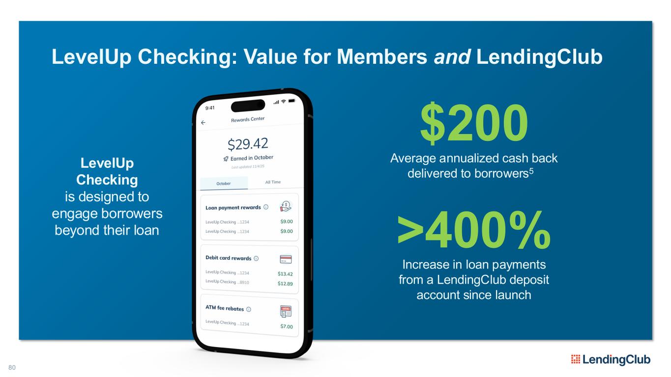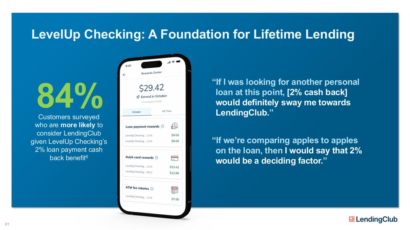 80 LevelUp Checking: Value for Members and LendingClub LevelUp Checking is designed to engage borrowers beyond their loan Increase in loan payments from a LendingClub deposit account since launch >400% Average annualized cash back delivered to borrowers5 $200