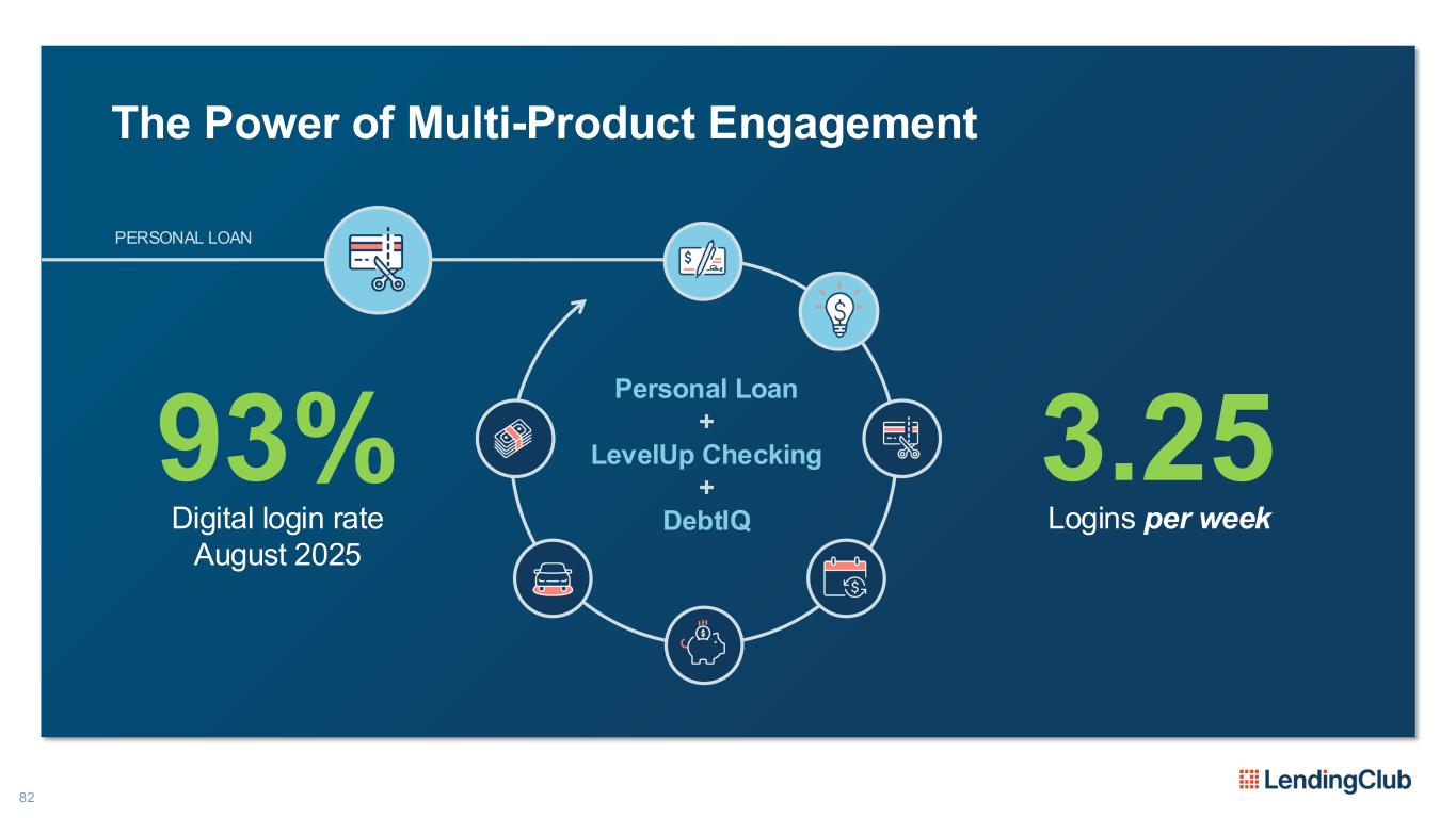 82 The Power of Multi-Product Engagement PERSONAL LOAN Personal Loan + LevelUp Checking + DebtIQ 93% Digital login rate August 2025 3.25 Logins per week