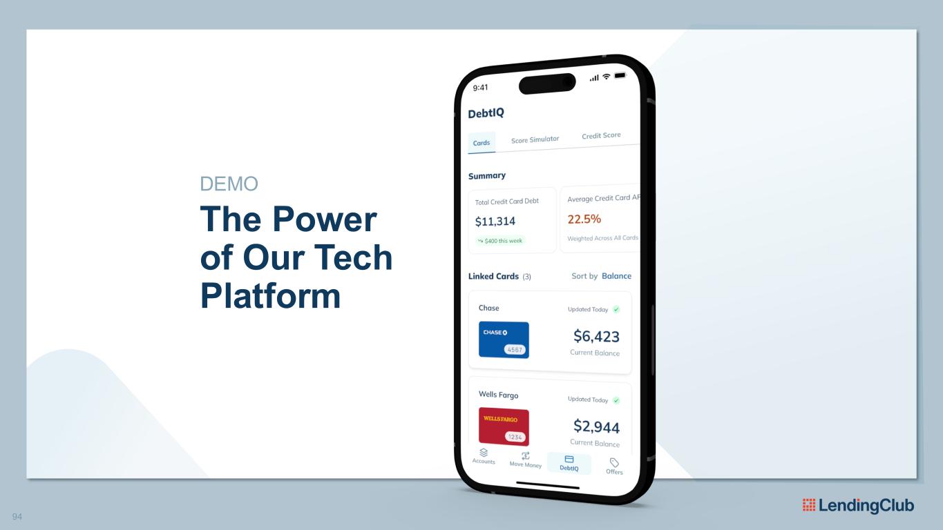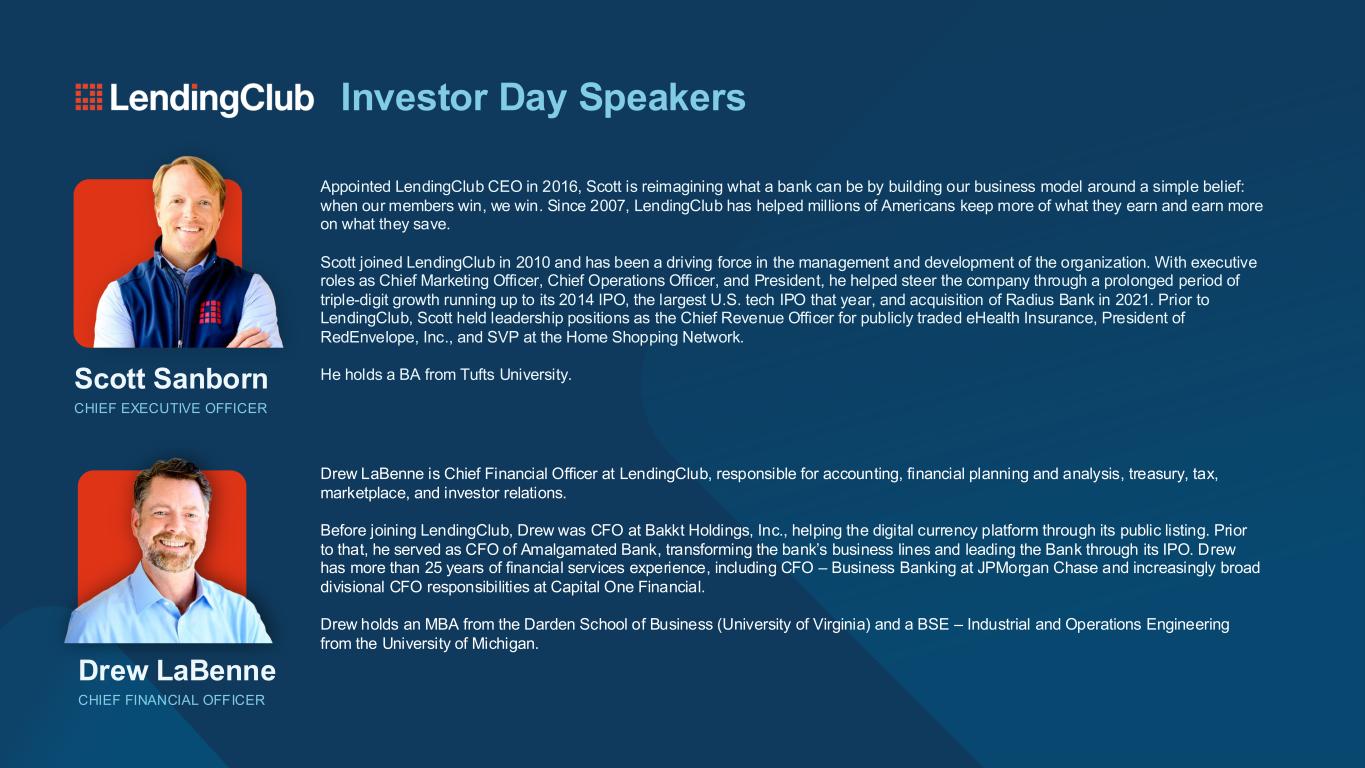 Investor Day Speakers Appointed LendingClub CEO in 2016, Scott is reimagining what a bank can be by building our business model around a simple belief: when our members win, we win. Since 2007, LendingClub has helped millions of Americans keep more of what they earn and earn more on what they save. Scott joined LendingClub in 2010 and has been a driving force in the management and development of the organization. With executive roles as Chief Marketing Officer, Chief Operations Officer, and President, he helped steer the company through a prolonged period of triple-digit growth running up to its 2014 IPO, the largest U.S. tech IPO that year, and acquisition of Radius Bank in 2021. Prior to LendingClub, Scott held leadership positions as the Chief Revenue Officer for publicly traded eHealth Insurance, President of RedEnvelope, Inc., and SVP at the Home Shopping Network. He holds a BA from Tufts University.Scott Sanborn CHIEF EXECUTIVE OFFICER Drew LaBenne is Chief Financial Officer at LendingClub, responsible for accounting, financial planning and analysis, treasury, tax, marketplace, and investor relations. Before joining LendingClub, Drew was CFO at Bakkt Holdings, Inc., helping the digital currency platform through its public listing. Prior to that, he served as CFO of Amalgamated Bank, transforming the bank’s business lines and leading the Bank through its IPO. Drew has more than 25 years of financial services experience, including CFO – Business Banking at JPMorgan Chase and increasingly broad divisional CFO responsibilities at Capital One Financial. Drew holds an MBA from the Darden School of Business (University of Virginia) and a BSE – Industrial and Operations Engineering from the University of Michigan. Drew LaBenne CHIEF FINANCIAL OFFICER