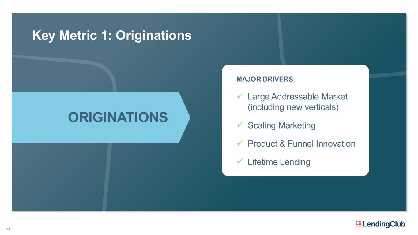 100 Key Metric 1: Originations ORIGINATIONS MAJOR DRIVERS ✓ Large Addressable Market (including new verticals) ✓ Scaling Marketing ✓ Product & Funnel Innovation ✓ Lifetime Lending