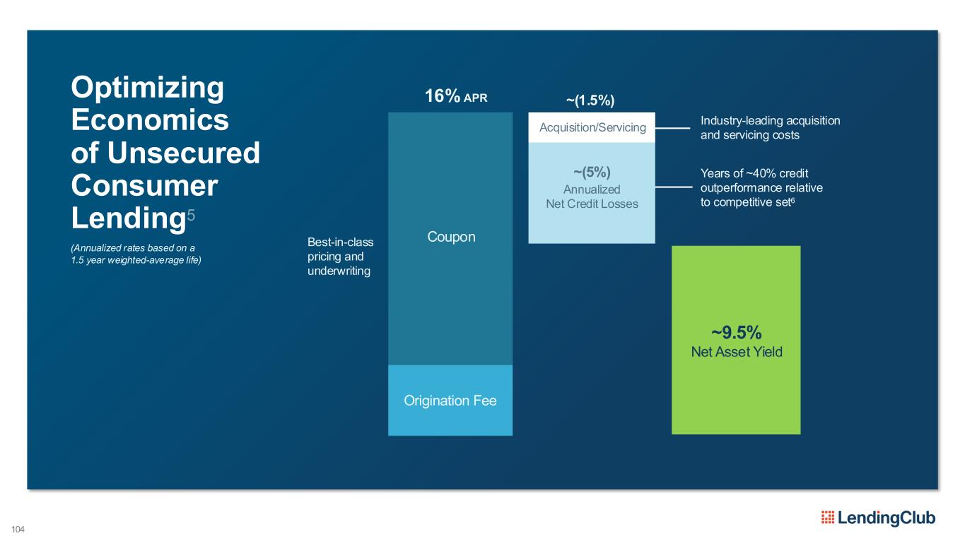 103 LendingClub Asset Yields Near Top of Industry Annualized Net Asset Yield4 1.4% 1.2% 1.3% 2.4% 2.9% 5.9% 5.9% 1.9% 1.9% 3.3% 3.4% 3.9% 6.9%Credit Cards LendingClub Personal Loans HELOC Prime Auto Loans Prime Private Student Loans First Lien Mortgages Investment Grade Securities 10% to 11% ~9.5% 6.5% to 7.5% 6% to 7% 5% to 7% 5.3% to 6% 5% to 5.5% Spread to risk-free benchmark rate3
