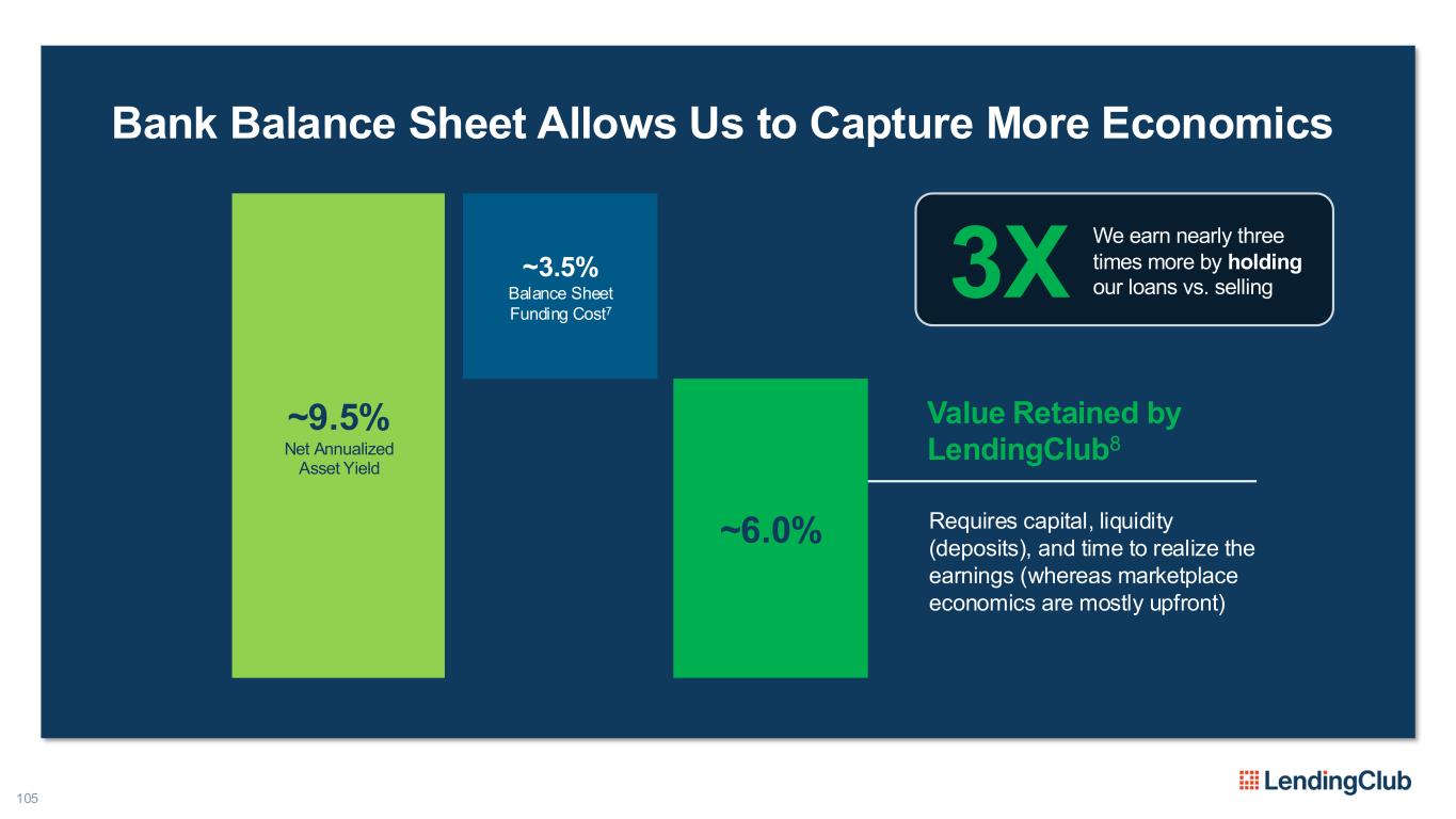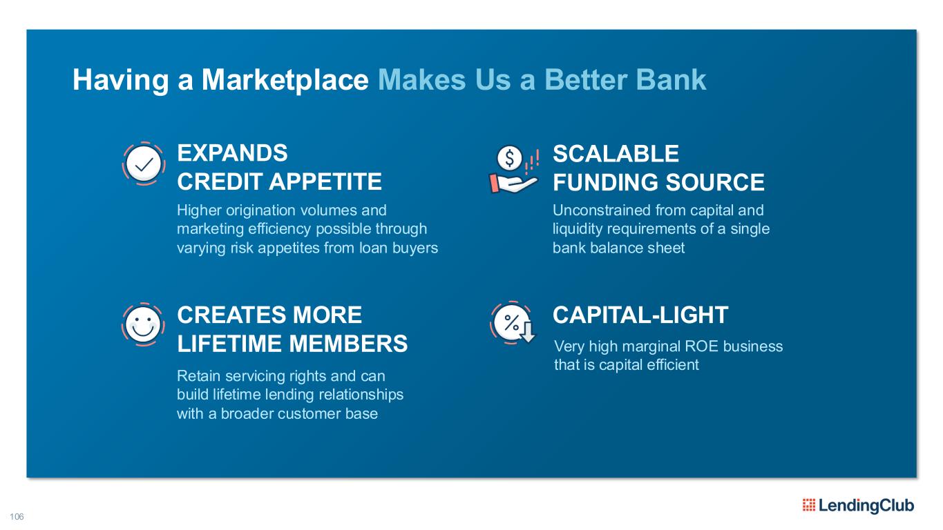 105 Bank Balance Sheet Allows Us to Capture More Economics Requires capital, liquidity (deposits), and time to realize the earnings (whereas marketplace economics are mostly upfront) Value Retained by LendingClub8 ~9.5% Net Annualized Asset Yield ~3.5% Balance Sheet Funding Cost7 ~6.0% 3X We earn nearly three times more by holding our loans vs. selling