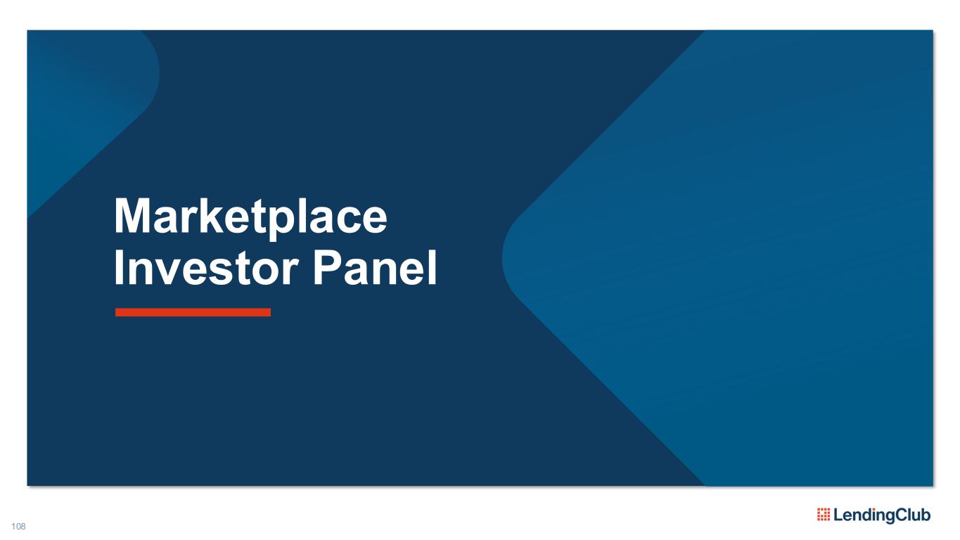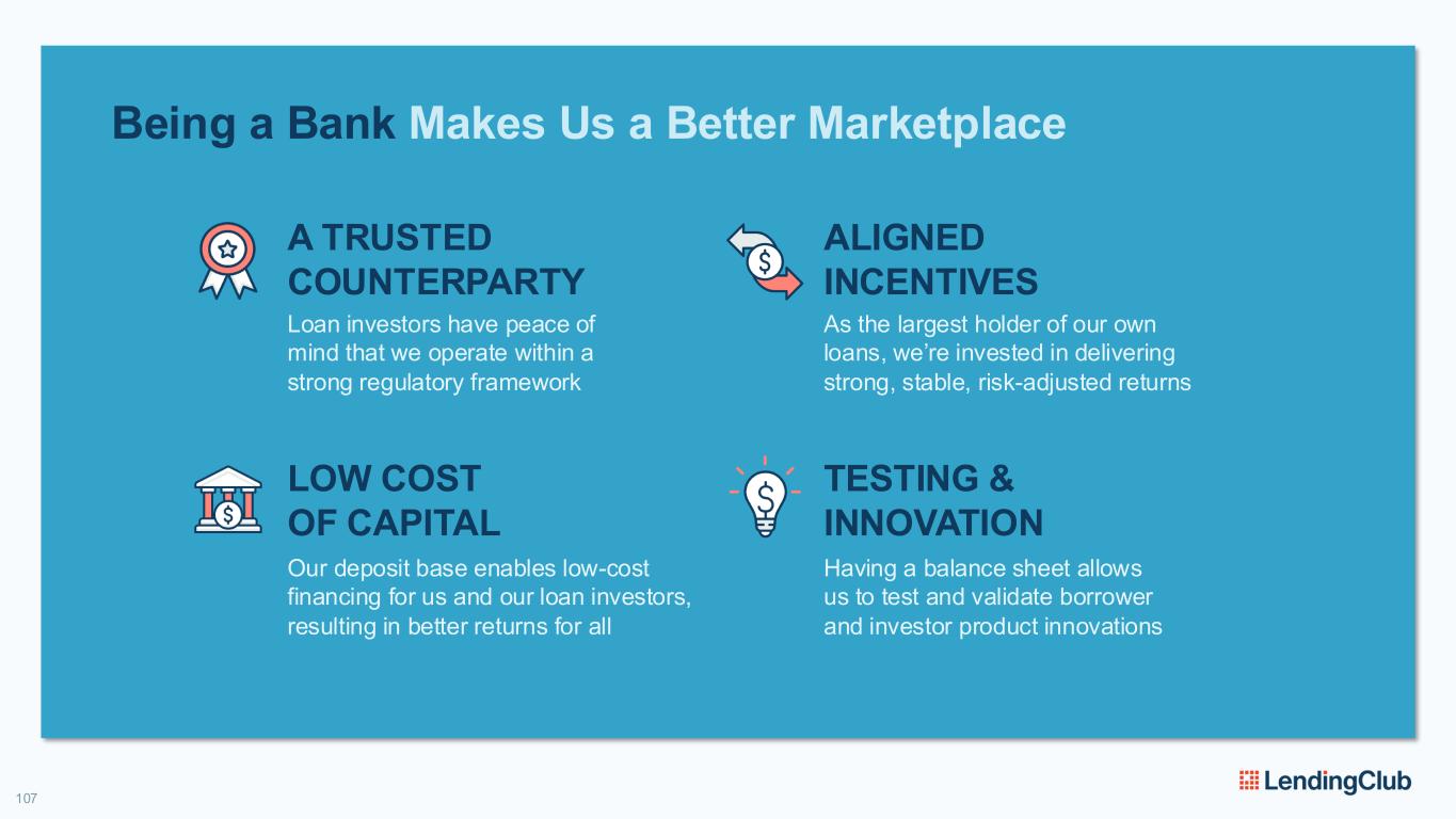 107 Being a Bank Makes Us a Better Marketplace A TRUSTED COUNTERPARTY Loan investors have peace of mind that we operate within a strong regulatory framework ALIGNED INCENTIVES As the largest holder of our own loans, we’re invested in delivering strong, stable, risk-adjusted returns LOW COST OF CAPITAL Our deposit base enables low-cost financing for us and our loan investors, resulting in better returns for all TESTING & INNOVATION Having a balance sheet allows us to test and validate borrower and investor product innovations
