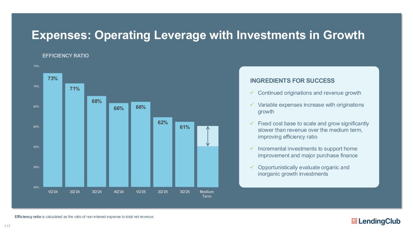 117 Expenses: Operating Leverage with Investments in Growth 73% 71% 68% 66% 66% 62% 61% 45% 50% 55% 60% 65% 70% 75% 1Q'24 2Q'24 3Q'24 4Q'24 1Q'25 2Q'25 3Q'25 Medium Term EFFICIENCY RATIO INGREDIENTS FOR SUCCESS ✓ Continued originations and revenue growth ✓ Variable expenses increase with originations growth ✓ Fixed cost base to scale and grow significantly slower than revenue over the medium term, improving efficiency ratio ✓ Incremental investments to support home improvement and major purchase finance ✓ Opportunistically evaluate organic and inorganic growth investments Efficiency ratio is calculated as the ratio of non-interest expense to total net revenue.