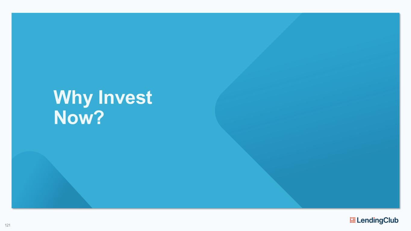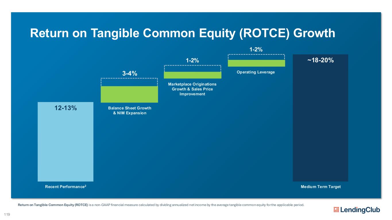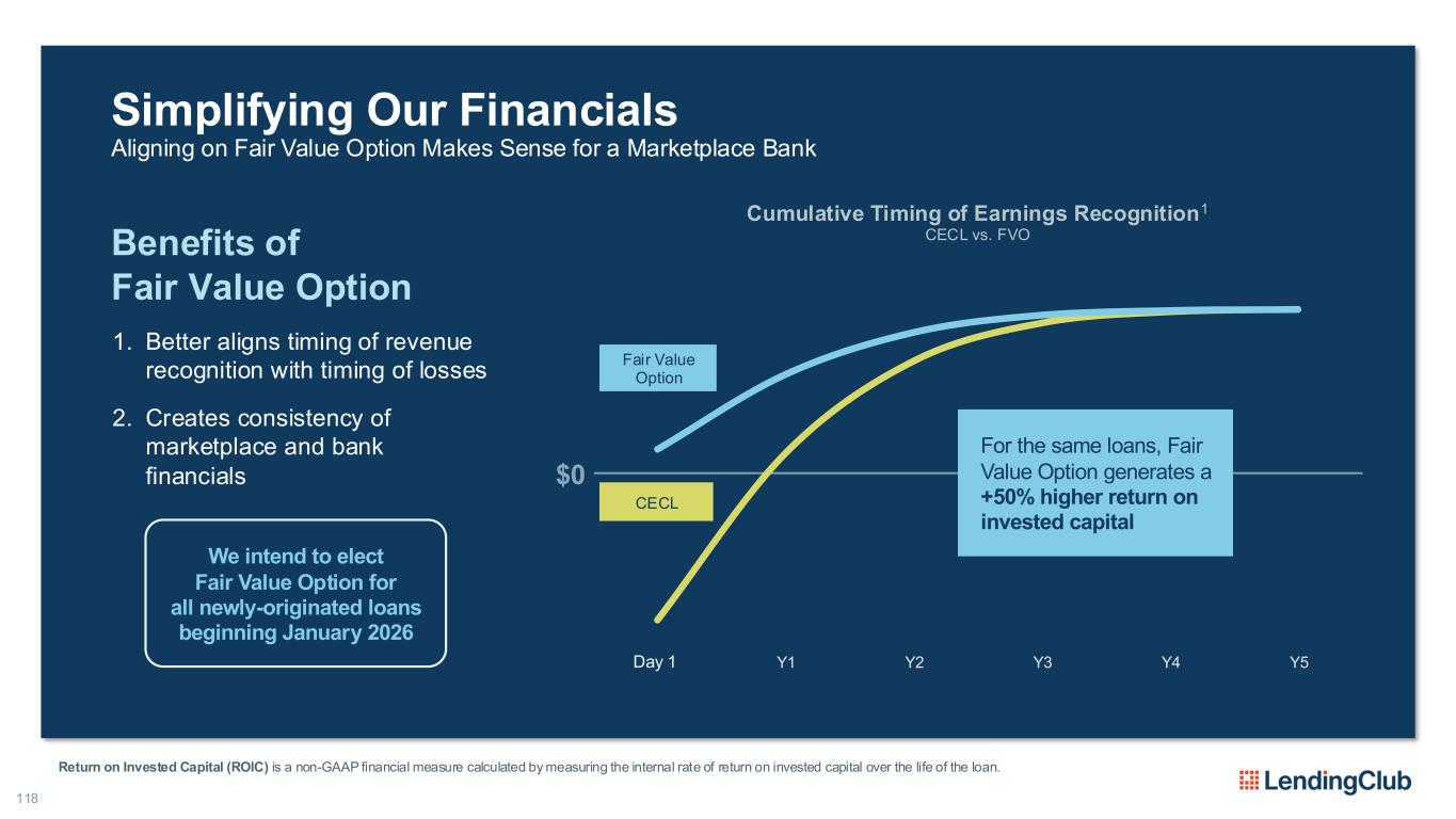 118 Simplifying Our Financials Aligning on Fair Value Option Makes Sense for a Marketplace Bank Benefits of Fair Value Option 1. Better aligns timing of revenue recognition with timing of losses 2. Creates consistency of marketplace and bank financials D1 Y1 Y2 Y3 Y4 Y5 Cumulative Timing of Earnings Recognition1 CECL vs. FVO CECL For the same loans, Fair Value Option generates a +50% higher return on invested capital Fair Value Option Day 1 We intend to elect Fair Value Option for all newly-originated loans beginning January 2026 $0 Return on Invested Capital (ROIC) is a non-GAAP financial measure calculated by measuring the internal rate of return on invested capital over the life of the loan.