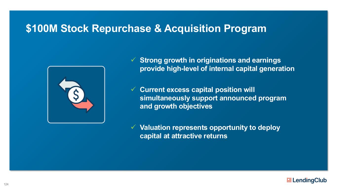 S&P Global Estimates as of October 31, 2025 FY26 Consensus Revenue Multiple P/TBV FY26 P/E Consensus 1.7x 1.3x 11.4x Peer 1 7.9x 4.7x 48.8x Peer 2 3.2x 4.4x 19.0x 123 Significant Discount to Peers ✓ Industry-leading credit performance ✓ Industry-leading acquisition efficiency ✓ Industry-leading profitability LendingClub represents a significant opportunity for investors