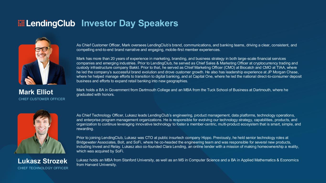Investor Day Speakers As Chief Customer Officer, Mark oversees LendingClub’s brand, communications, and banking teams, driving a clear, consistent, and compelling end-to-end brand narrative and engaging, mobile-first member experiences. Mark has more than 20 years of experience in marketing, branding, and business strategy in both large-scale financial services companies and emerging industries. Prior to LendingClub, he served as Chief Sales & Marketing Officer at cryptocurrency trading and custody infrastructure company Bakkt. Prior to that, he served as Chief Marketing Officer (CMO) at Biocatch and CMO at TIAA, where he led the company’s successful brand evolution and drove customer growth. He also has leadership experience at JP Morgan Chase, where he helped manage efforts to transition to digital banking, and at Capital One, where he led the national direct-to-consumer deposit business and efforts to expand retail banking into new geographies. Mark holds a BA in Government from Dartmouth College and an MBA from the Tuck School of Business at Dartmouth, where he graduated with honors. Mark Elliot CHIEF CUSTOMER OFFICER As Chief Technology Officer, Lukasz leads LendingClub’s engineering, product management, data platforms, technology operations, and enterprise program management organizations. He is responsible for evolving our technology strategy, capabilities, products, and organization to continue leveraging innovative technology to foster a member-centric, multi-product ecosystem that is smart, simple, and rewarding. Prior to joining LendingClub, Lukasz was CTO at public insurtech company Hippo. Previously, he held senior technology roles at Bridgewater Associates, Bolt, and SoFi, where he co-headed the engineering team and was responsible for several new products, including Invest and Relay. Lukasz also co-founded Clara Lending, an online lender with a mission of making homeownership a reality, which was acquired by SoFi. Lukasz holds an MBA from Stanford University, as well as an MS in Computer Science and a BA in Applied Mathematics & Economics from Harvard University. Lukasz Strozek CHIEF TECHNOLOGY OFFICER
