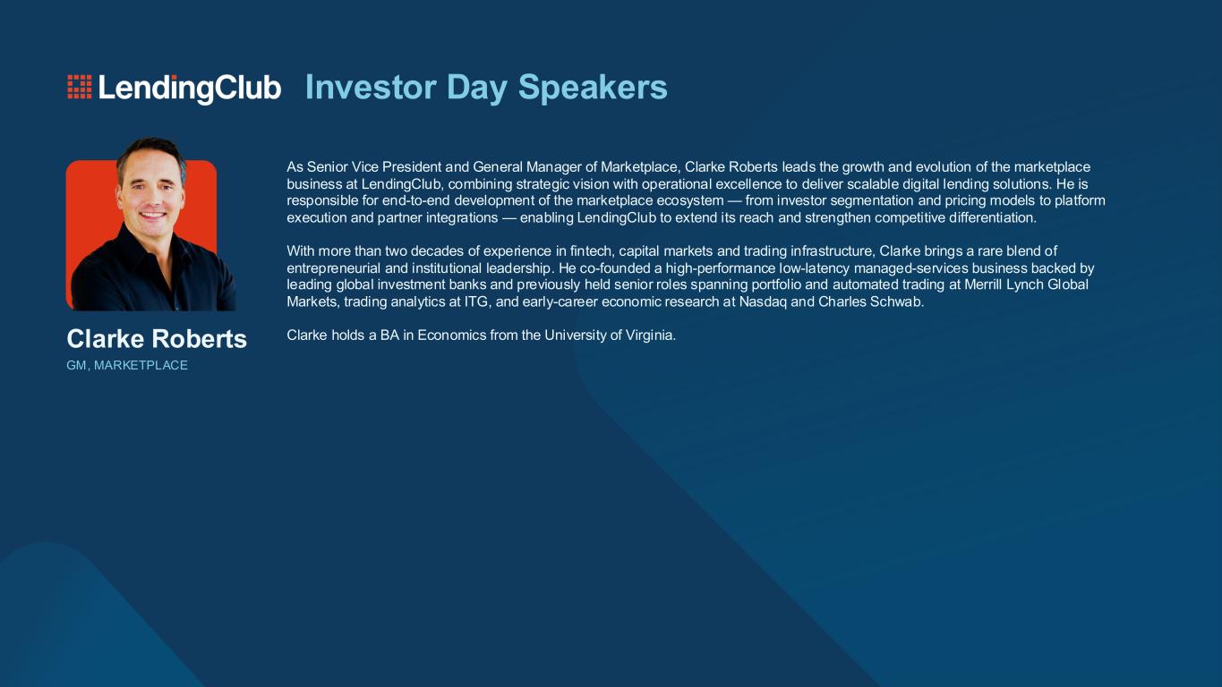 Investor Day Speakers As Senior Vice President and General Manager of Marketplace, Clarke Roberts leads the growth and evolution of the marketplace business at LendingClub, combining strategic vision with operational excellence to deliver scalable digital lending solutions. He is responsible for end-to-end development of the marketplace ecosystem — from investor segmentation and pricing models to platform execution and partner integrations — enabling LendingClub to extend its reach and strengthen competitive differentiation. With more than two decades of experience in fintech, capital markets and trading infrastructure, Clarke brings a rare blend of entrepreneurial and institutional leadership. He co-founded a high-performance low-latency managed-services business backed by leading global investment banks and previously held senior roles spanning portfolio and automated trading at Merrill Lynch Global Markets, trading analytics at ITG, and early-career economic research at Nasdaq and Charles Schwab. Clarke holds a BA in Economics from the University of Virginia.Clarke Roberts GM, MARKETPLACE