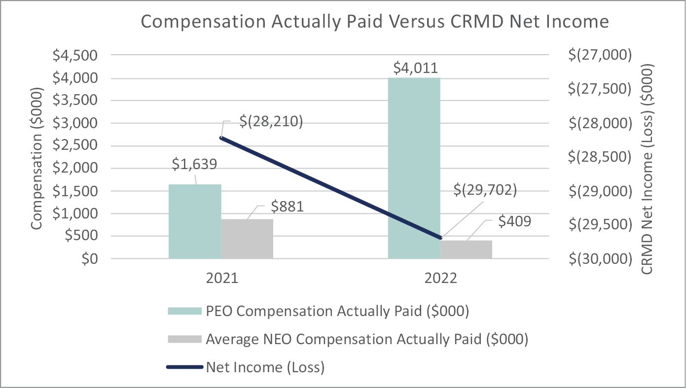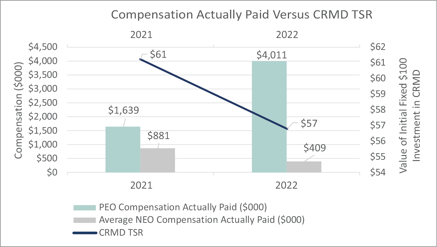 (5) Total Shareholder Return shown in this table assumes $100 was invested for the period starting December 31, 2020 through December 31 of the applicable fiscal year in the Company’s common stock as traded under ticker CRMD on Nasdaq. The historical stock price performance of our common stock shown is not necessarily indicative of future stock price performance.