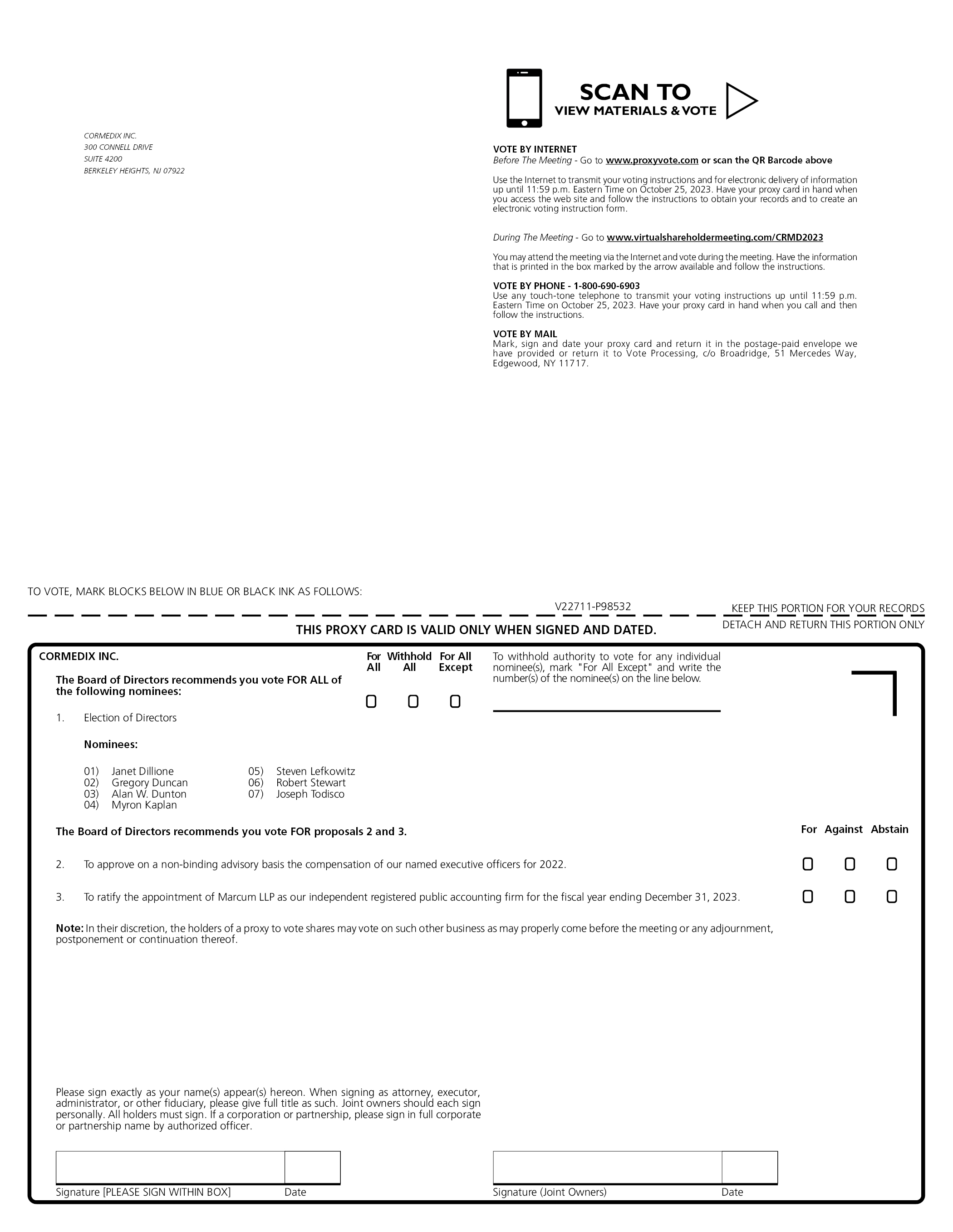 SCAN TO VIEW MATERIALS & VOTE CORMEDIX INC. 300 CONNELL DRIVE SUITE 4200 BERKELEY HEIGHTS, NJ 07922 VOTE BY INTERNET Before The Meeting - Go to www.proxyvote.com or scan the QR Barcode above Use the Internet to transmit your voting instructions and for electronic delivery of information up until 11:59 p.m. Eastern Time on October 25, 2023. Have your proxy card in hand when you access the web site and follow the instructions to obtain your records and to create an electronic voting instruction form. During The Meeting - Go to www.virtualshareholdermeeting.com/CRMD2023 You may attend the meeting via the Internet and vote during the meeting. Have the information that is printed in the box marked by the arrow available and follow the instructions. VOTE BY PHONE - 1-800-690-6903 Use any touch-tone telephone to transmit your voting instructions up until 11:59 p.m. Eastern Time on October 25, 2023. Have your proxy card in hand when you call and then follow the instructions. VOTE BY MAIL Mark, sign and date your proxy card and return it in the postage-paid envelope we have provided or return it to Vote Processing, c/o Broadridge, 51 Mercedes Way, Edgewood, NY 11717. TO VOTE, MARK BLOCKS BELOW IN BLUE OR BLACK INK AS FOLLOWS: V22711-P98532 KEEP THIS PORTION FOR YOUR RECORDS DETACH AND RETURN THIS PORTION ONLY THIS PROXY CARD IS VALID ONLY WHEN SIGNED AND DATED. CORMEDIX INC. The Board of Directors recommends you vote FOR ALL of the following nominees: For All Withhold All For All Except 1. Election of Directors Nominees: 01) Janet Dillione 02) Gregory Duncan 03) Alan W. Dunton 04) Myron Kaplan 05) Steven Lefkowitz 06) Robert Stewart 07) Joseph Todisco To withhold authority to vote for any individual nominee(s), mark “For All Except” and write the number(s) of the nominee(s) on the line below. The Board of Directors recommends you vote FOR proposals 2 and 3. 2. To approve on a non-binding advisory basis the compensation of our named executive officers for 2022. 3. To ratify the appointment of Marcum LLP as our independent registered public accounting firm for the fiscal year ending December 31, 2023. Note: In their discretion, the holders of a proxy to vote shares may vote on such other business as may properly come before the meeting or any adjournment, postponement or continuation thereof. For Against Abstain Please sign exactly as your name(s) appear(s) hereon. When signing as attorney, executor, administrator, or other fiduciary, please give full title as such. Joint owners should each sign personally. All holders must sign. If a corporation or partnership, please sign in full corporate or partnership name by authorized officer. Signature [PLEASE SIGN WITHIN BOX] Date Signature (Joint Owners) Date