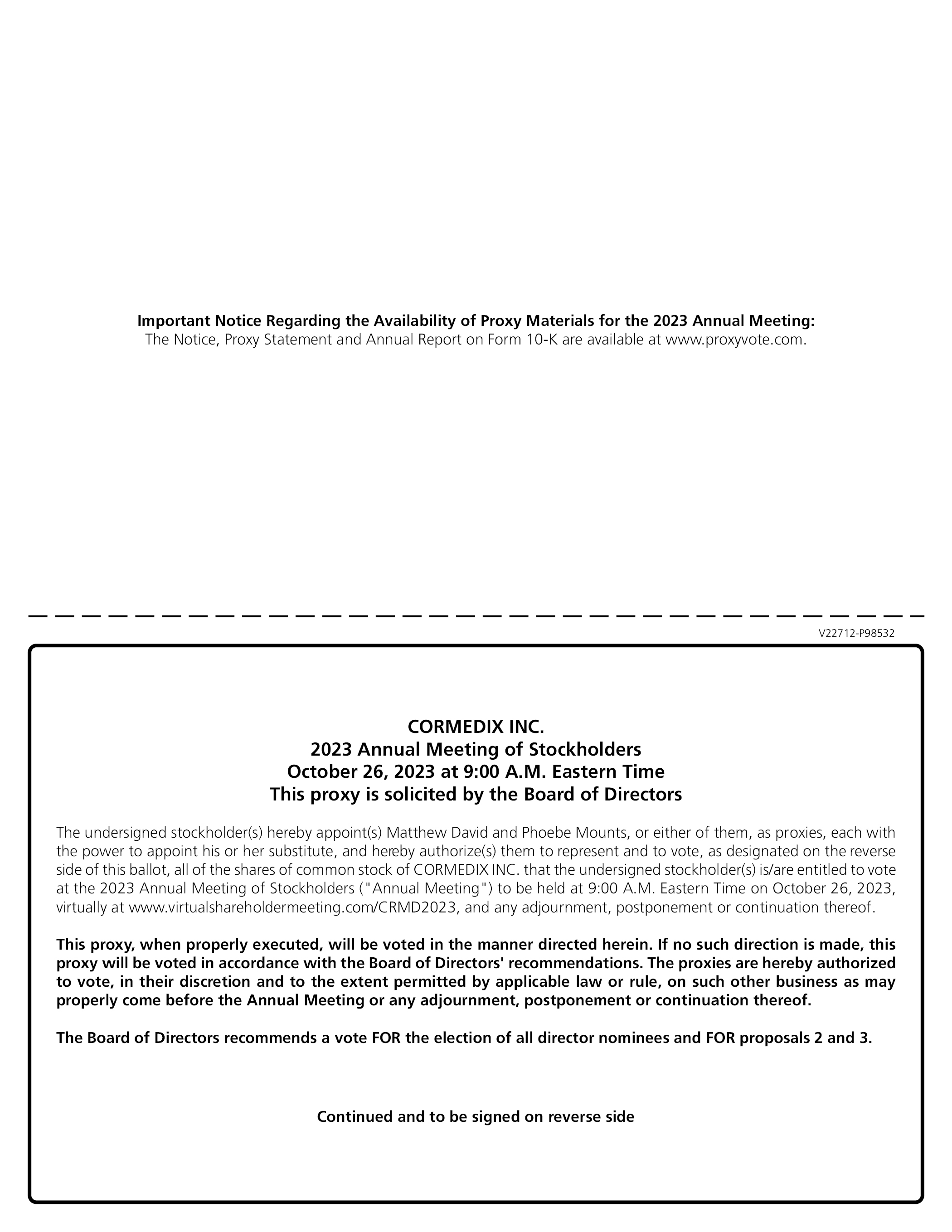 Important Notice Regarding the Availability of Proxy Materials for the 2023 Annual Meeting:The Notice, Proxy Statement and Annual Report on Form 10-K are available at www.proxyvote.com. V22712-P98532 CORMEDIX INC. 2023 Annual Meeting of Stockholders October 26, 2023 at 9:00 A.M. Eastern Time This proxy is solicited by the Board of Directors The undersigned stockholder(s) hereby appoint(s) Matthew David and Phoebe Mounts, or either of them, as proxies, each with the power to appoint his or her substitute, and hereby authorize(s) them to represent and to vote, as designated on the reverse side of this ballot, all of the shares of common stock of CORMEDIX INC. that the undersigned stockholder(s) is/are entitled to vote at the 2023 Annual Meeting of Stockholders (“Annual Meeting”) to be held at 9:00 A.M. Eastern Time on October 26, 2023, virtually at www.virtualshareholdermeeting.com/CRMD2023, and any adjournment, postponement or continuation thereof. This proxy, when properly executed, will be voted in the manner directed herein. If no such direction is made, this proxy will be voted in accordance with the Board of Directors’ recommendations. The proxies are hereby authorized to vote, in their discretion and to the extent permitted by applicable law or rule, on such other business as may properly come before the Annual Meeting or any adjournment, postponement or continuation thereof. The Board of Directors recommends a vote FOR the election of all director nominees and FOR proposals 2 and 3. Continued and to be signed on reverse side