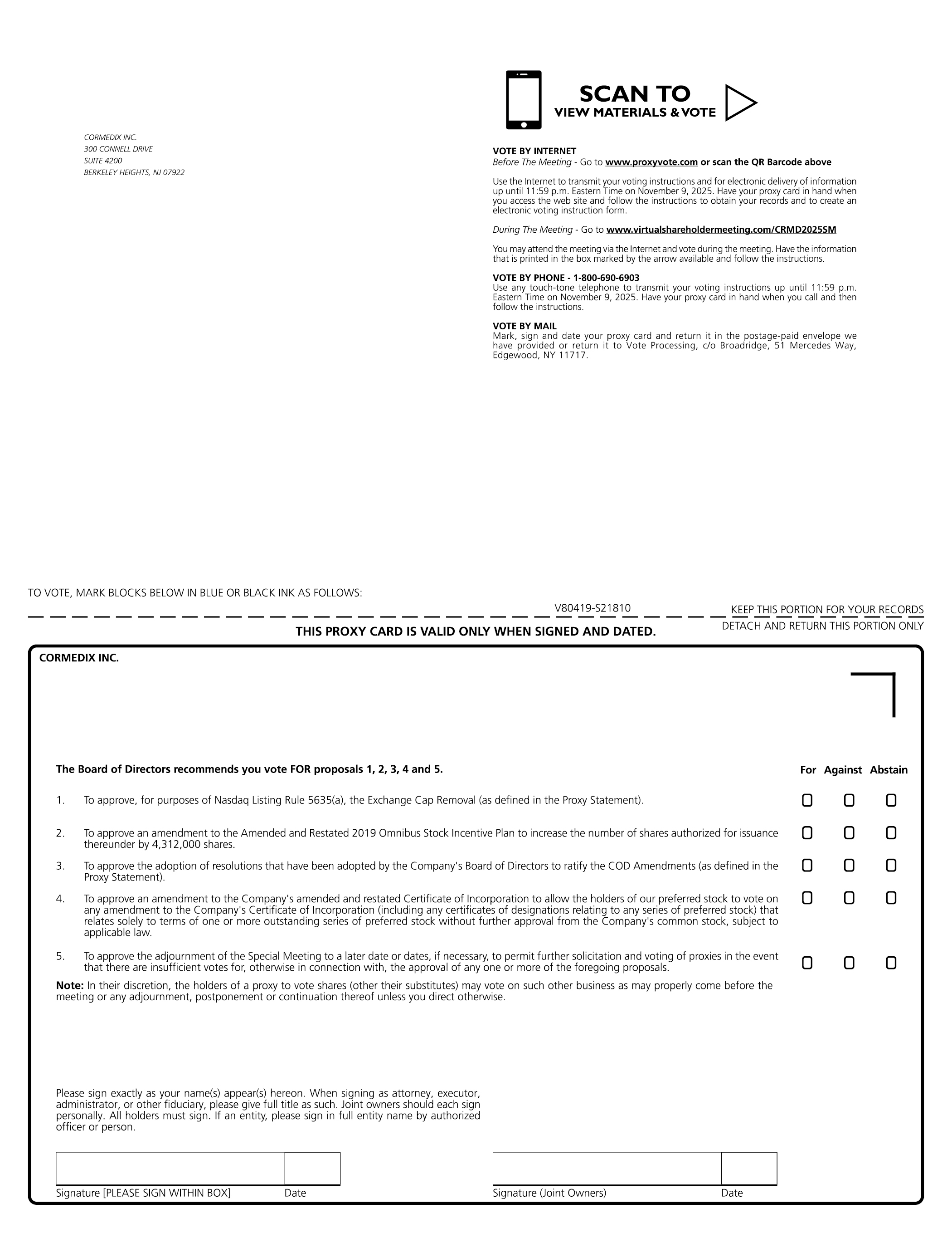 CORMEDIX INC. 300 CONNELL DRIVE SUITE 4200 BERKELEY HEIGHTS, NJ 07922 SCAN TO VIEW MATERIALS & VOTE VOTE BY INTERNET Before The Meeting - Go to www.proxyvote.com or scan the QR Barcode above Use the Internet to transmit your voting instructions and for electronic delivery of information up until 11:59 p.m. Eastern Time on November 9, 2025. Have your proxy card in hand when you access the web site and follow the instructions to obtain your records and to create an electronic voting instruction form. During The Meeting - Go to www.virtualshareholdermeeting.com/CRMD2025SM You may attend the meeting via the Internet and vote during the meeting. Have the information that is printed in the box marked by the arrow available and follow the instructions. VOTE BY PHONE - 1-800-690-6903 Use any touch-tone telephone to transmit your voting instructions up until 11:59 p.m. Eastern Time on November 9, 2025. Have your proxy card in hand when you call and then follow the instructions. VOTE BY MAIL Mark, sign and date your proxy card and return it in the postage-paid envelope we have provided or return it to Vote Processing, c/o Broadridge, 51 Mercedes Way, Edgewood, NY 11717. TO VOTE, MARK BLOCKS BELOW IN BLUE OR BLACK INK AS FOLLOWS: V80419-S21810 KEEP THIS PORTION FOR YOUR RECORDS THIS PROXY CARD IS VALID ONLY WHEN SIGNED AND DATED. DETACH AND RETURN THIS PORTION ONLY CORMEDIX INC. For Against Abstain The Board of Directors recommends you vote FOR proposals 1, 2, 3, 4 and 5. 2. To approve an amendment to the Amended and Restated 2019 Omnibus Stock Incentive Plan to increase the number of shares authorized for issuance thereunder by 4,312,000 shares. 3. To approve the adoption of resolutions that have been adopted by the Company’s Board of Directors to ratify the COD Amendments (as defined in the Proxy Statement). 4. To approve an amendment to the Company’s amended and restated Certificate of Incorporation to allow the holders of our preferred stock to vote on any amendment to the Company’s Certificate of Incorporation (including any certificates of designations relating to any series of preferred stock) that relates solely to terms of one or more outstanding series of preferred stock without further approval from the Company’s common stock, subject to applicable law. 1. To approve, for purposes of Nasdaq Listing Rule 5635(a), the Exchange Cap Removal (as defined in the Proxy Statement). 5. To approve the adjournment of the Special Meeting to a later date or dates, if necessary, to permit further solicitation and voting of proxies in the event that there are insufficient votes for, otherwise in connection with, the approval of any one or more of the foregoing proposals. Note: In their discretion, the holders of a proxy to vote shares (other their substitutes) may vote on such other business as may properly come before the meeting or any adjournment, postponement or continuation thereof unless you direct otherwise. Please sign exactly as your name(s) appear(s) hereon. When signing as attorney, executor, administrator, or other fiduciary, please give full title as such. Joint owners should each sign personally. All holders must sign. If an entity, please sign in full entity name by authorized officer or person. Signature [PLEASE SIGN WITHIN BOX] Date Signature (Joint Owners) Date
