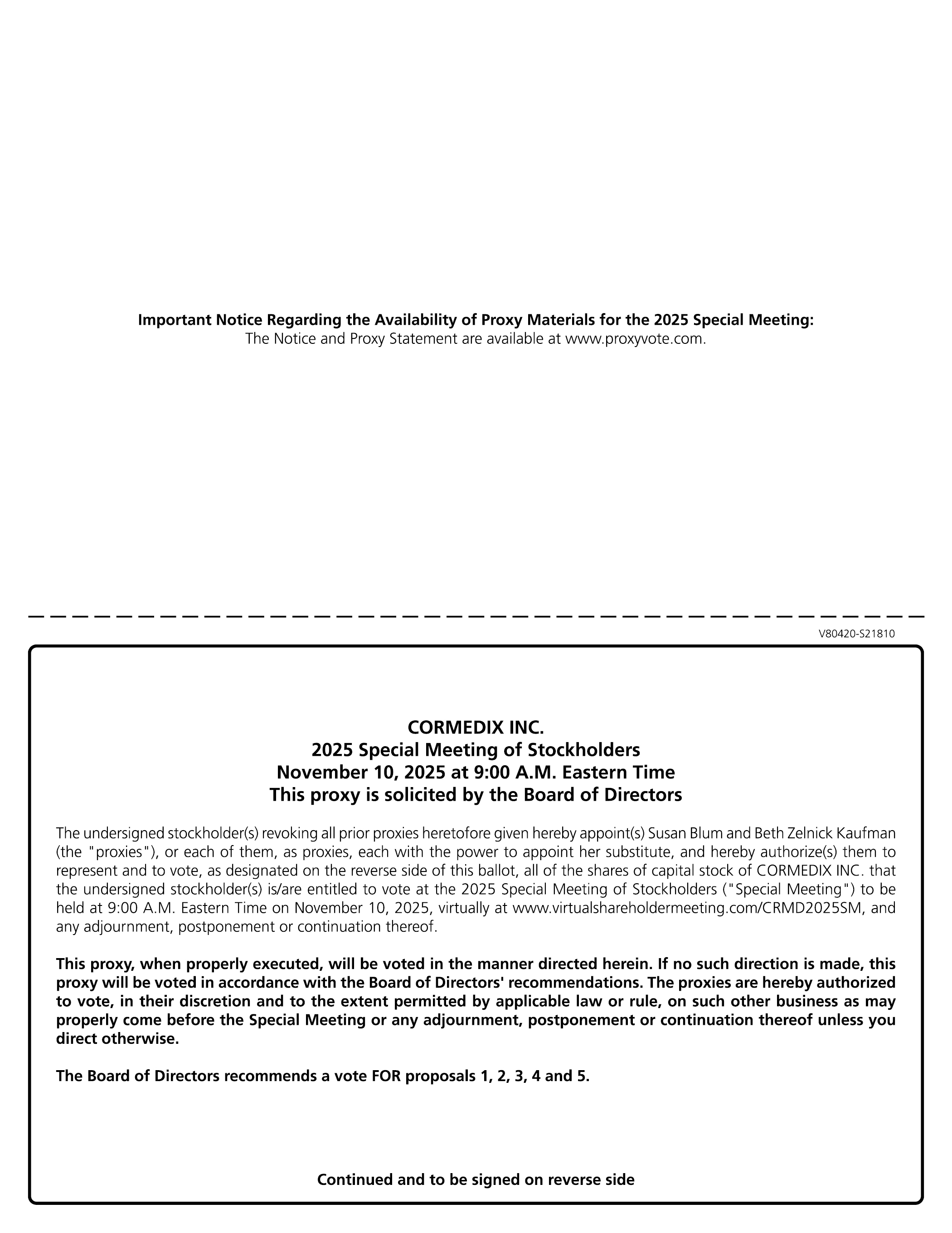Important Notice Regarding the Availability of Proxy Materials for the 2025 Special Meeting:The Notice and Proxy Statement are available at www.proxyvote.com. V80420-S21810 CORMEDIX INC. 2025 Special Meeting of Stockholders November 10, 2025 at 9:00 A.M. Eastern Time This proxy is solicited by the Board of Directors The undersigned stockholder(s) revoking all prior proxies heretofore given hereby appoint(s) Susan Blum and Beth Zelnick Kaufman (the “proxies”), or each of them, as proxies, each with the power to appoint her substitute, and hereby authorize(s) them to represent and to vote, as designated on the reverse side of this ballot, all of the shares of capital stock of CORMEDIX INC. that the undersigned stockholder(s) is/are entitled to vote at the 2025 Special Meeting of Stockholders (“Special Meeting”) to be held at 9:00 A.M. Eastern Time on November 10, 2025, virtually at www.virtualshareholdermeeting.com/CRMD2025SM, and any adjournment, postponement or continuation thereof. This proxy, when properly executed, will be voted in the manner directed herein. If no such direction is made, this proxy will be voted in accordance with the Board of Directors’ recommendations. The proxies are hereby authorized to vote, in their discretion and to the extent permitted by applicable law or rule, on such other business as may properly come before the Special Meeting or any adjournment, postponement or continuation thereof unless you direct otherwise. The Board of Directors recommends a vote FOR proposals 1, 2, 3, 4 and 5. Continued and to be signed on reverse side