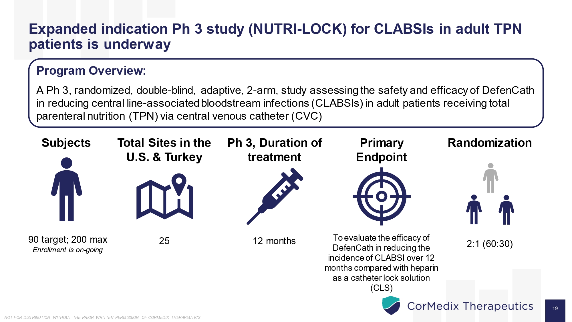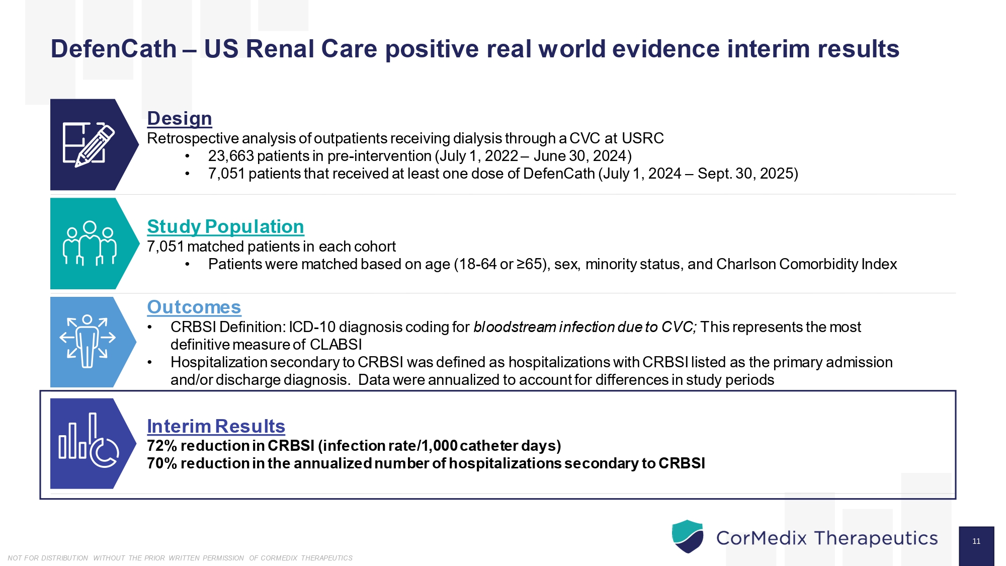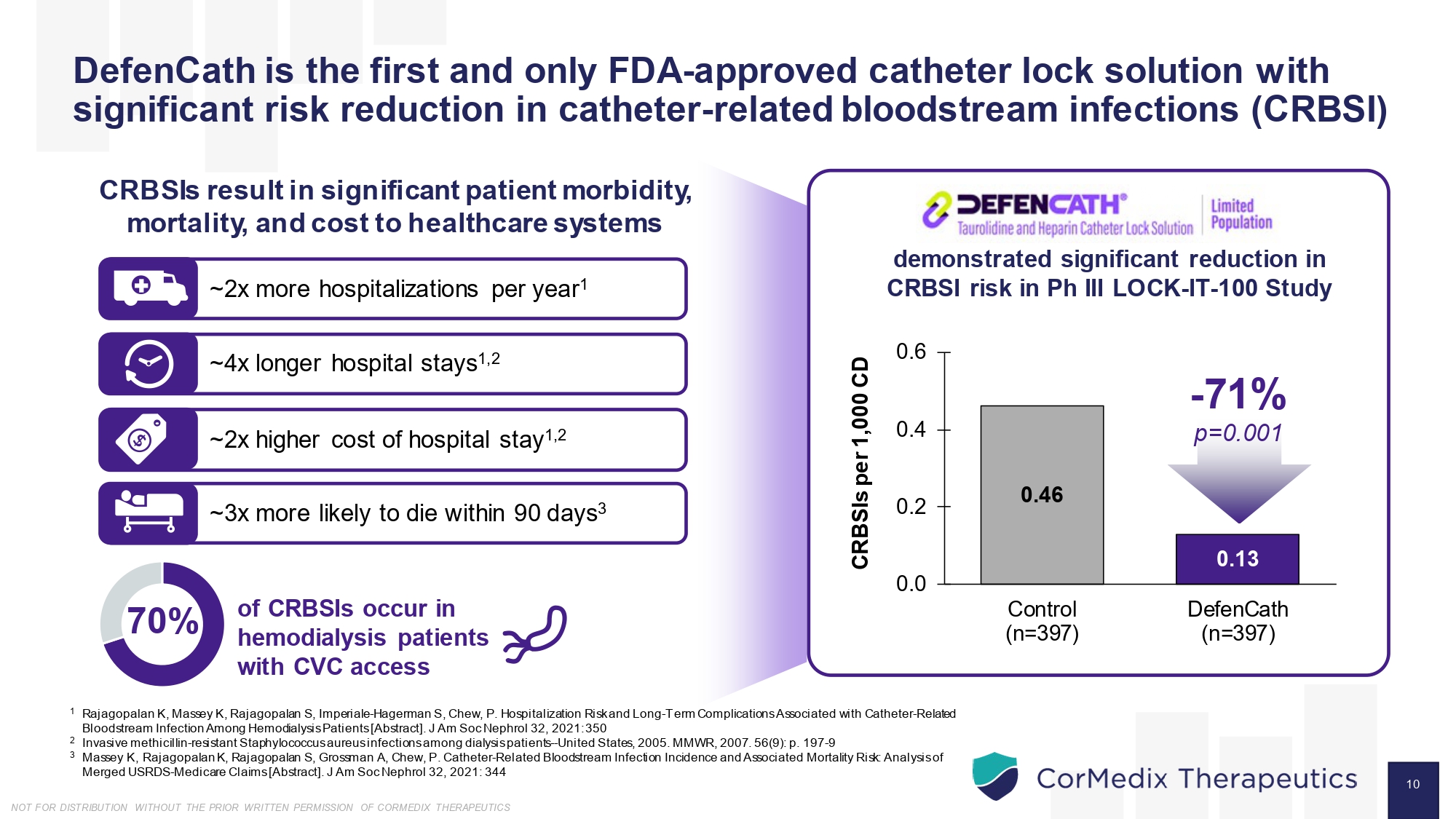 NOT FOR DISTRIBUTION WITHOUT THE PRIOR WRITTEN PERMISSION OF CORMEDIX THERAPEUTICS 0.46 0.13 0.0 0.2 0.4 0.6 Control (n=397) DefenCath (n=397) CRBSIs per 1,000 CD 10 DefenCath is the first and only FDA - approved catheter lock solution with significant risk reduction in catheter - related bloodstream infections (CRBSI) CRBSIs result in significant patient morbidity, mortality, and cost to healthcare systems demonstrated significant reduction in CRBSI risk in Ph III LOCK - IT - 100 Study - 71% p=0.001 of CRBSIs occur in hemodialysis patients with CVC access 1 Rajagopalan K, Massey K, Rajagopalan S, Imperiale - Hagerman S, Chew, P. Hospitalization Risk and Long - Term Complications Associ ated with Catheter - Related Bloodstream Infection Among Hemodialysis Patients [Abstract]. J Am Soc Nephrol 32, 2021: 350 2 Invasive methicillin - resistant Staphylococcus aureus infections among dialysis patients -- United States, 2005. MMWR, 2007. 56(9 ): p. 197 - 9 3 Massey K, Rajagopalan K, Rajagopalan S, Grossman A, Chew, P. Catheter - Related Bloodstream Infection Incidence and Associated M ortality Risk: Analysis of Merged USRDS - Medicare Claims [Abstract]. J Am Soc Nephrol 32, 2021: 344 70% ~4x longer hospital stays 1,2 ~2x more hospitalizations per year 1 ~2x higher cost of hospital stay 1,2 ~3x more likely to die within 90 days 3
